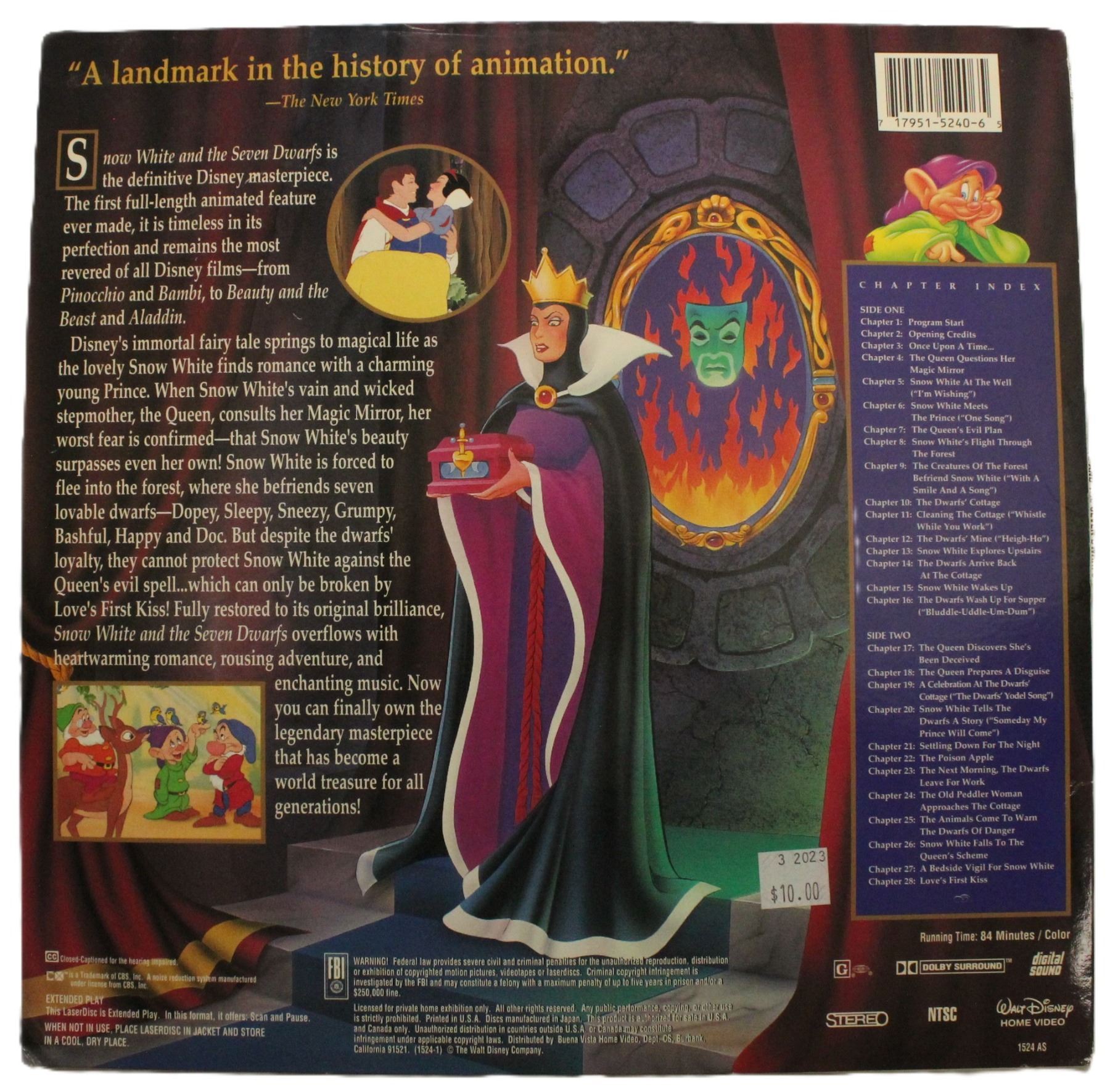 Walt Disney's Masterpiece Collection LaserDisc. Disc appears in excellent condition. Sleeve has some tearing at the bottom seam.