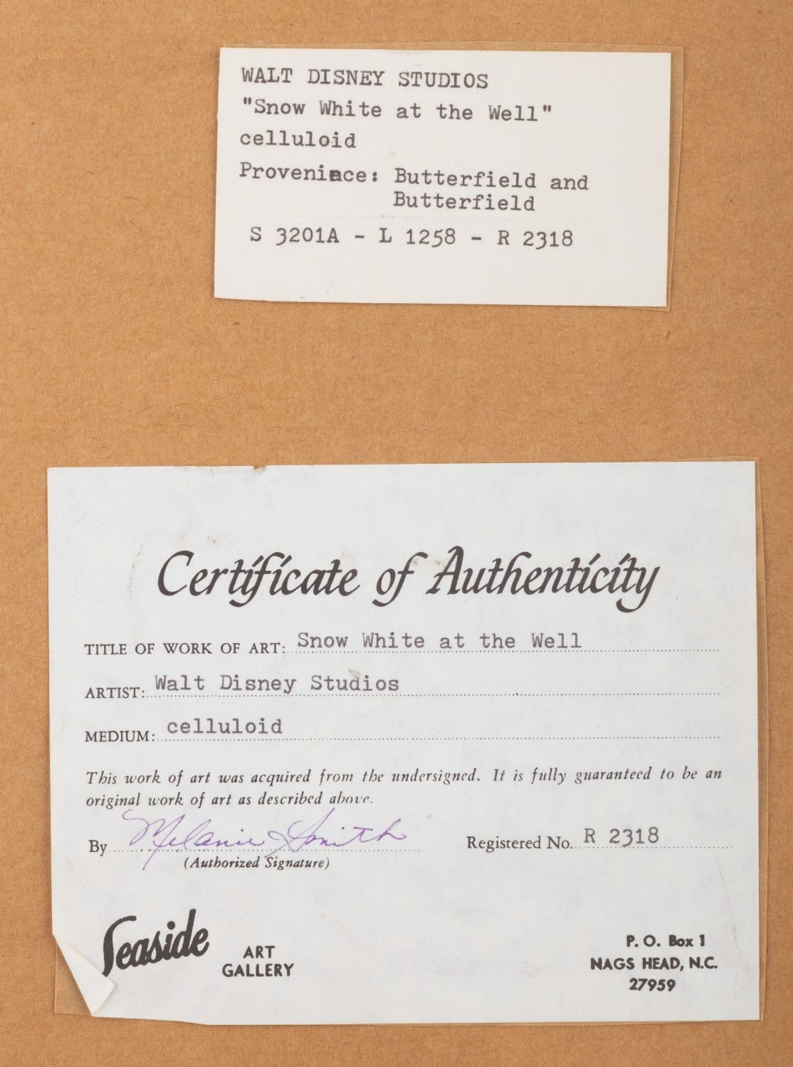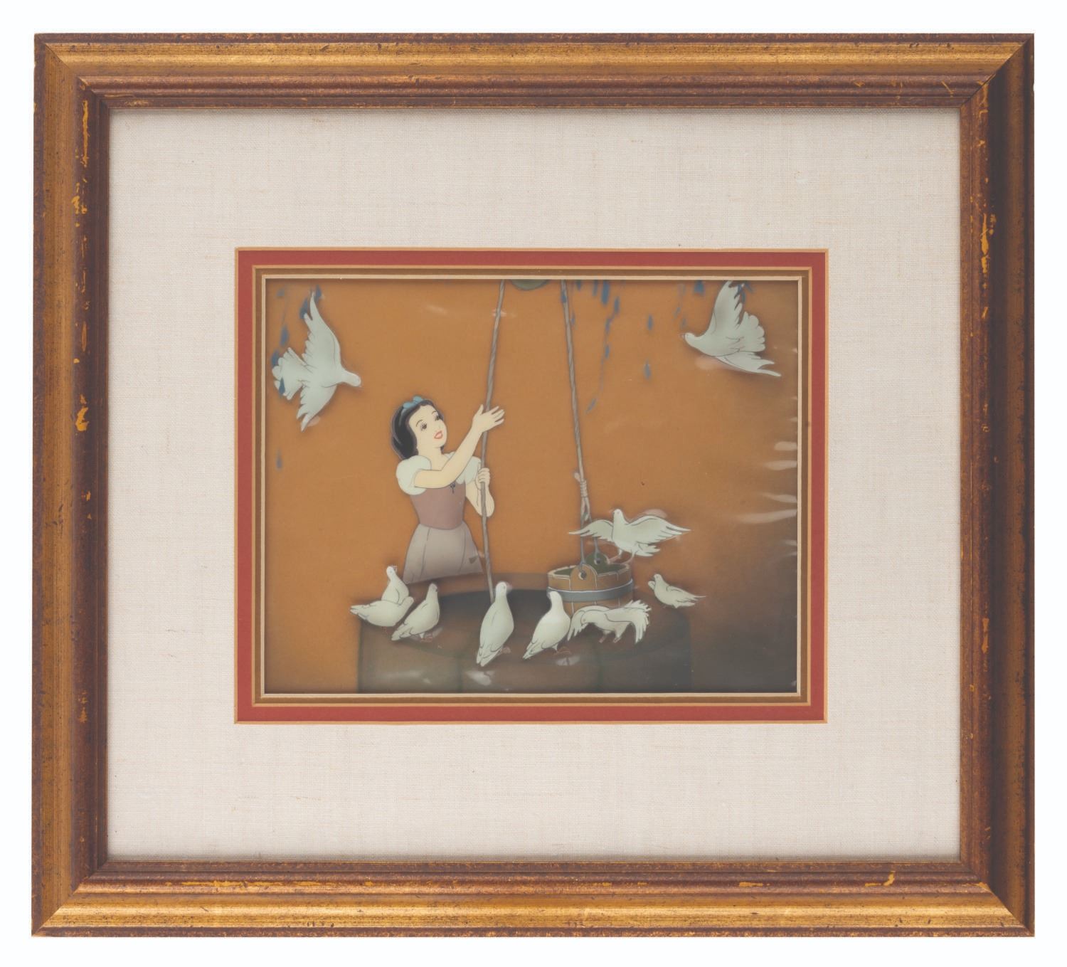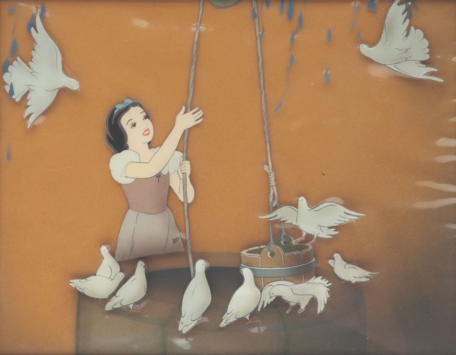 (Disney, 1937) An exceptional original production cel of Snow White at the well from Disney’s 1937 masterpiece,"Snow White and the Seven Dwarfs." This key scene in the film introduces us to Snow White as she sings her signature theme,"I’m Wishing." The cel of Snow White has been slightly trimmed and placed on an airbrushed background with a cel overlay of vines and doves as prepared by Courvoisier Galleries for sale. Snow White measures 3.75" x 2" and the entire piece measures 10" x 8" in a 19" x 17" frame. The reverse of the frame has stickers from its previous sales at auction houses and galleries. The cel is in very good condition with a small spot of paint lifting in Snow White’s dress near where it meets the rope. The cel has some wrinkling along the edges, which is very common for these pieces, and the wooden frame is worn and chipped throughout. The cel presents exceptionally well and is one of the better images from this scene that we have seen.