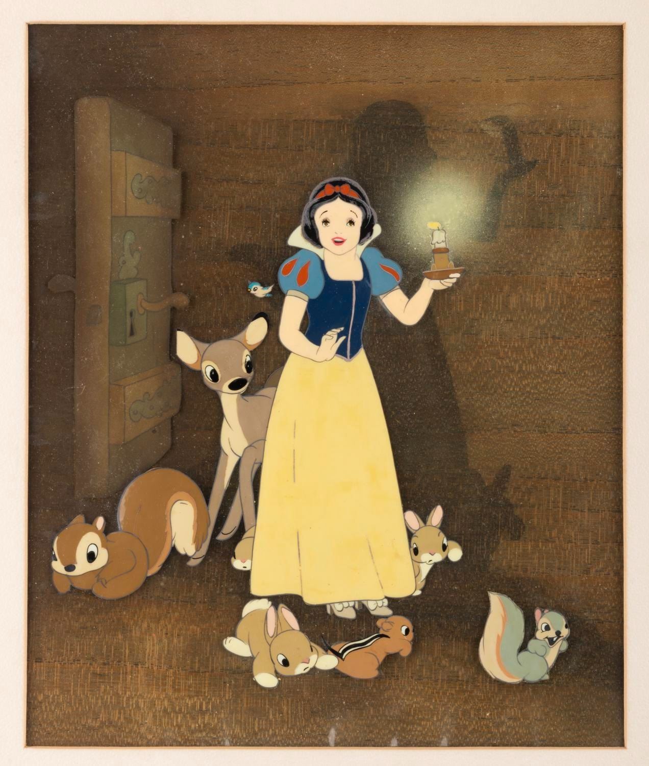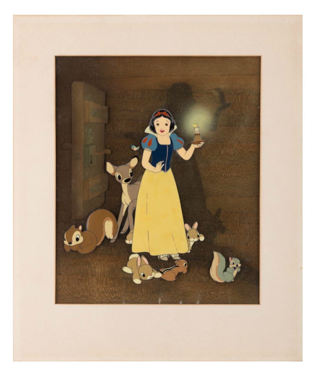 (Disney, 1937) Original production cels of Snow White, woodland creatures, and a door from Walt Disney’s masterpiece “Snow White and the Seven Dwarfs.” The cels have been trimmed to image and placed on an airbrushed woodgrain background as prepared by Courvoisier Galleries for sale. The characters have an image size of 6.5” x 7.5” on a 7.25” x 8.75” visible cel. The entire matted piece measures 10.25” x 12.25”. The art is in very good condition with light spots of paint loss, warping, scratches, and discoloration to the matte.
