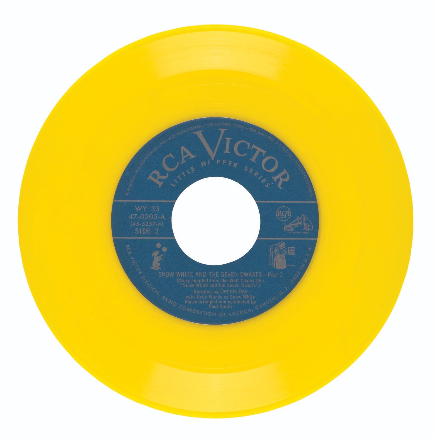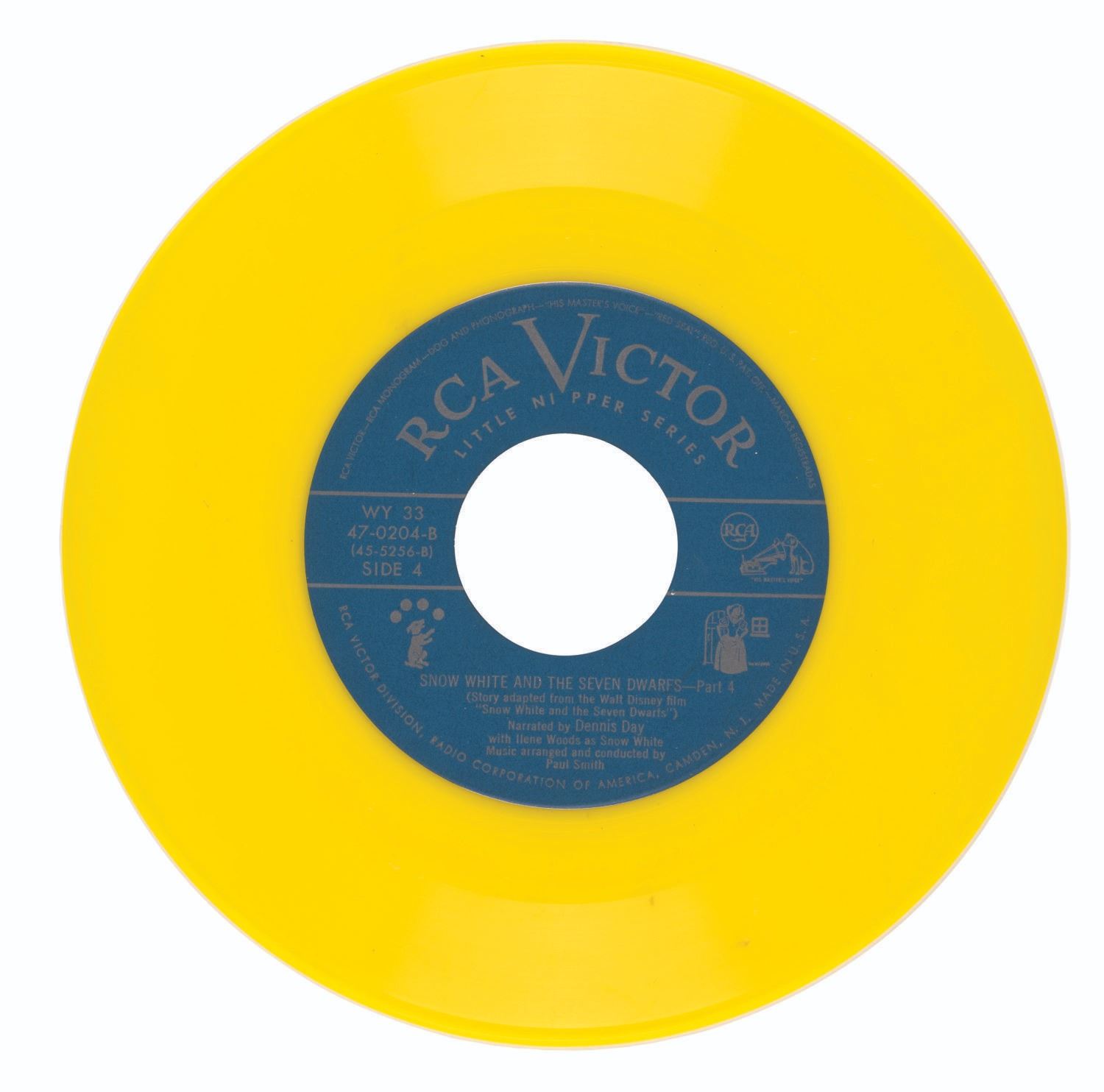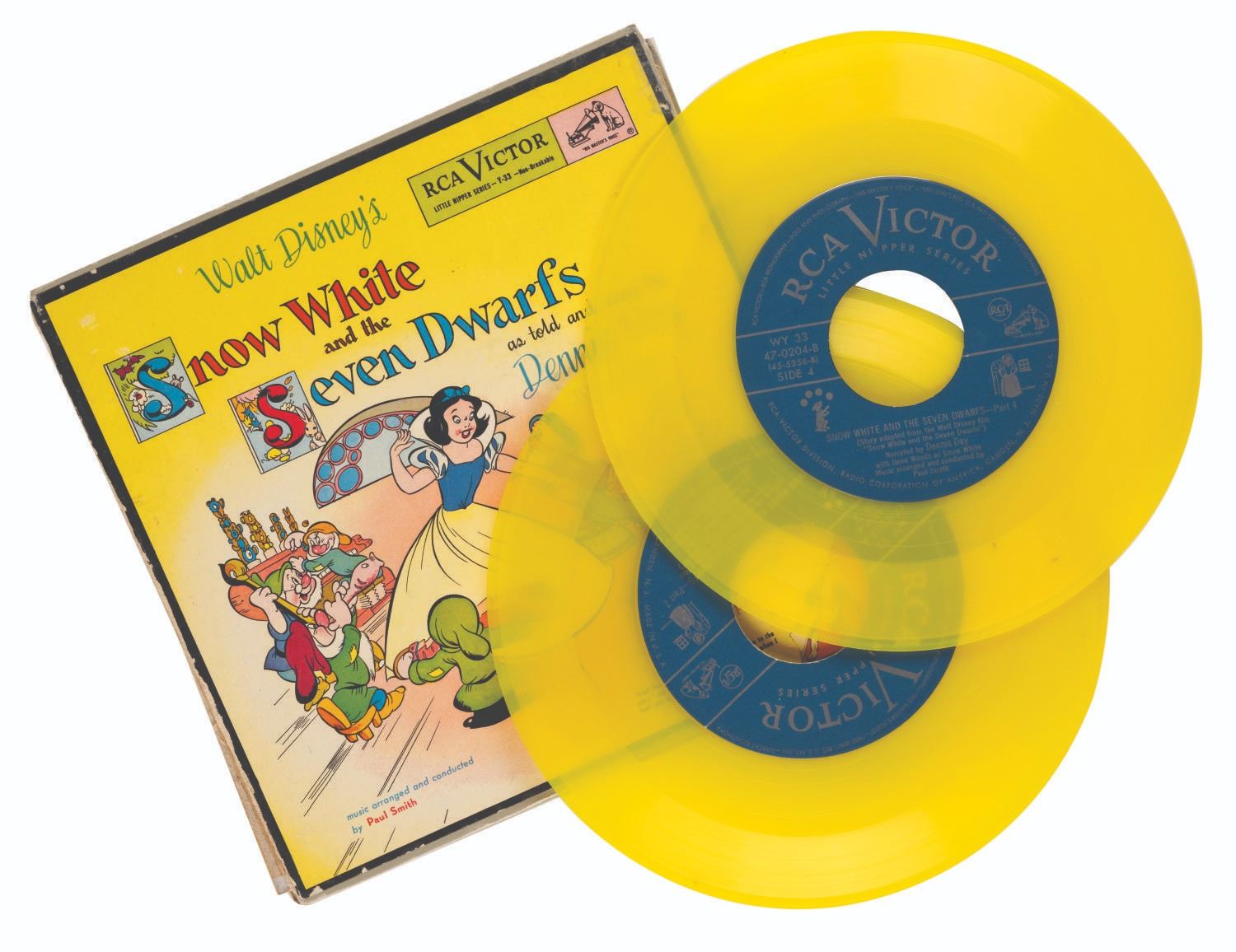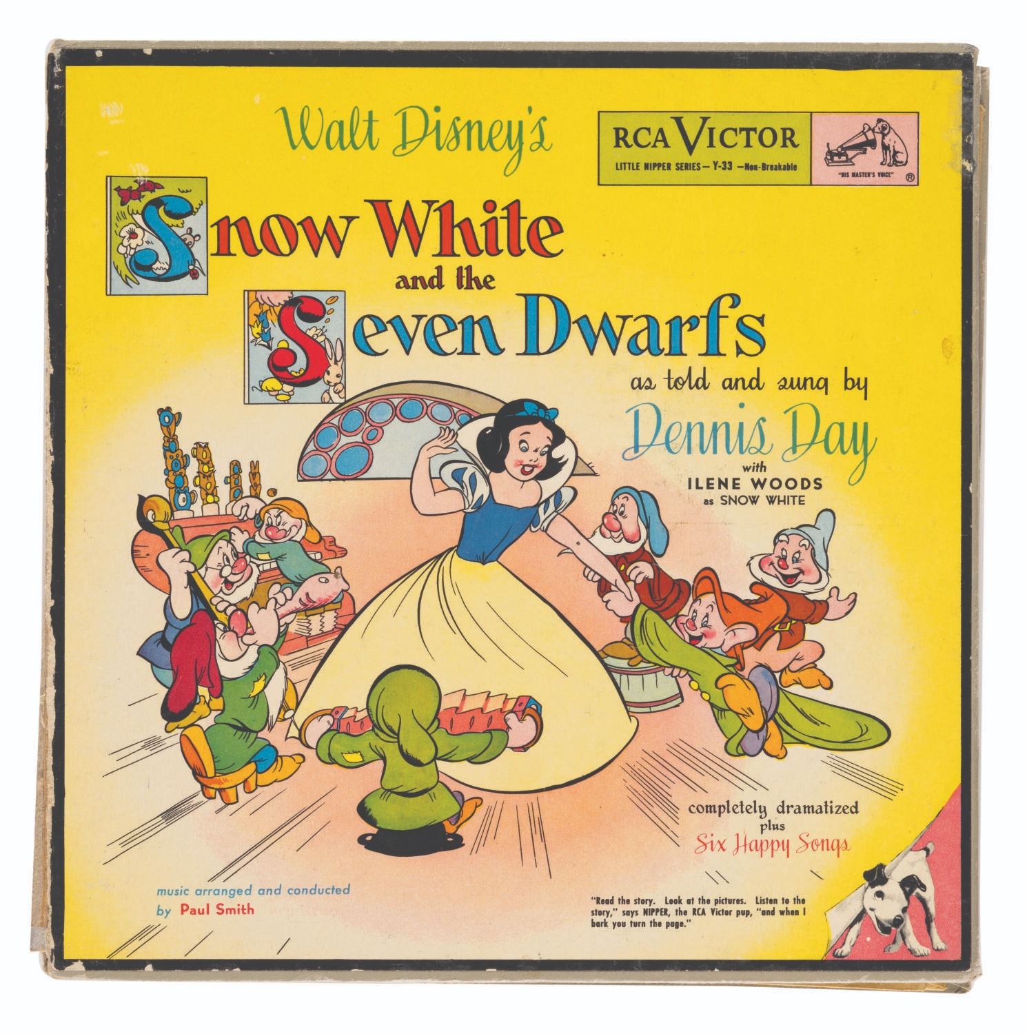 (RCA Victor, 1949) A storybook and two record set of Walt Disney's "Snow White and the Seven Dwarfs" read by Dennis Day and Ilene Woods. Measuring 7.25" x 7.25", the book is in fair condition with a detached spine, edge wear, ink marks on the interior, and a torn record sleeve. The records are in fine, untested condition.