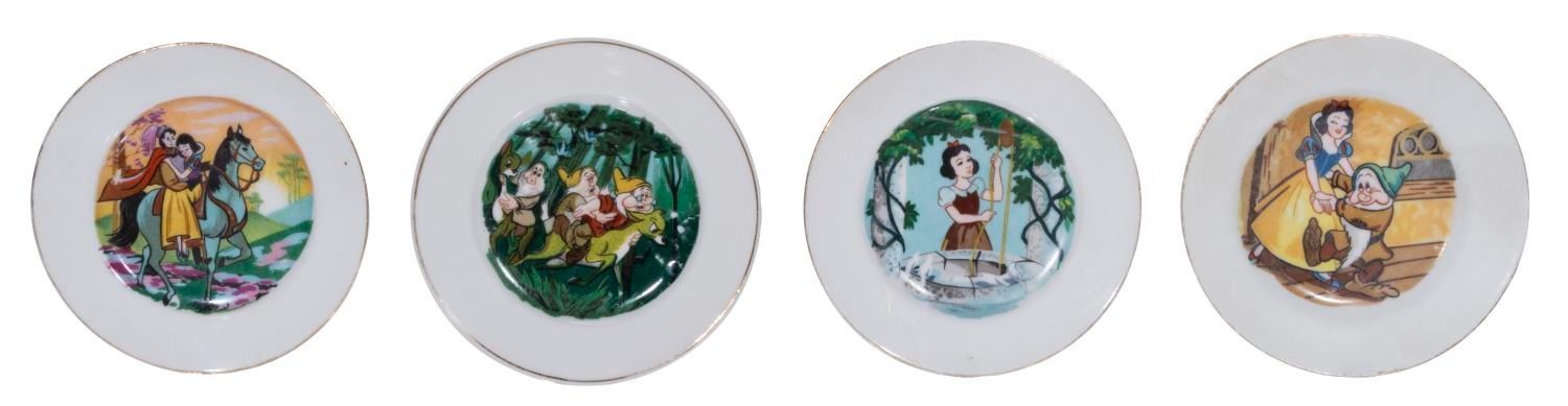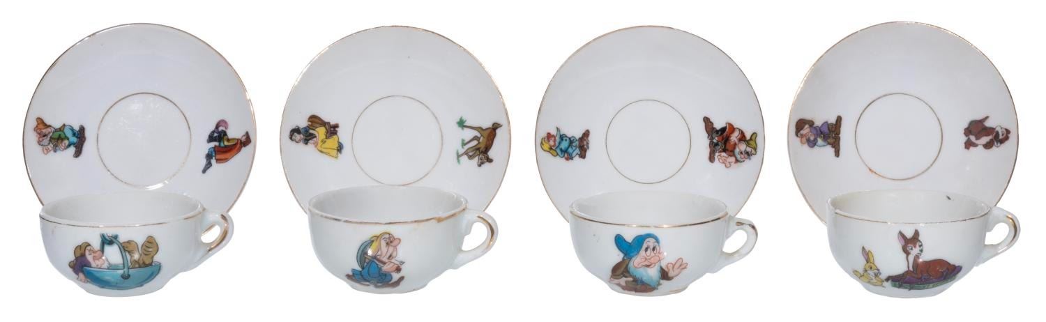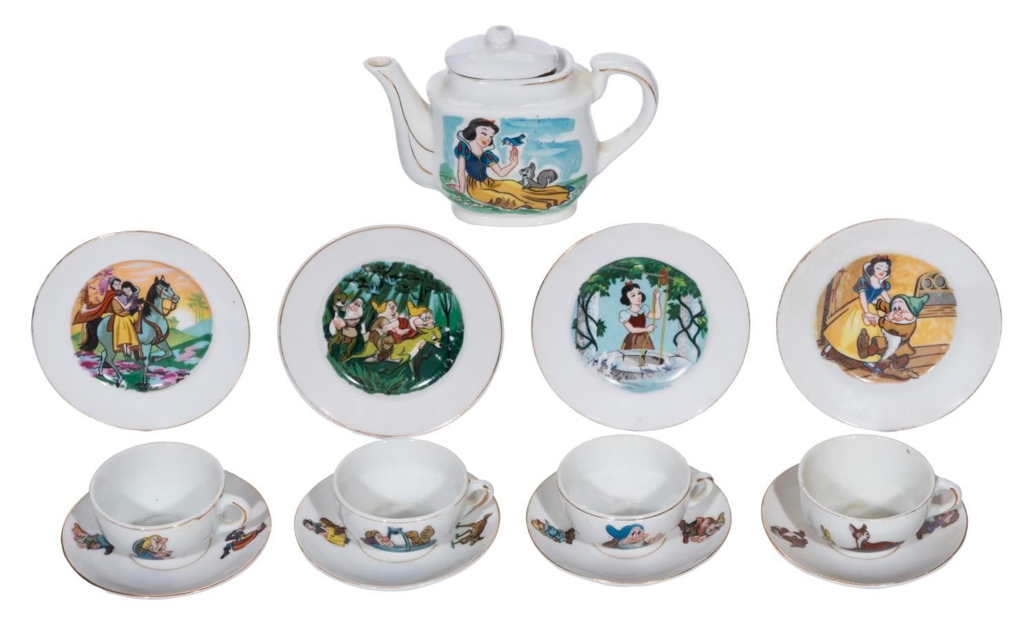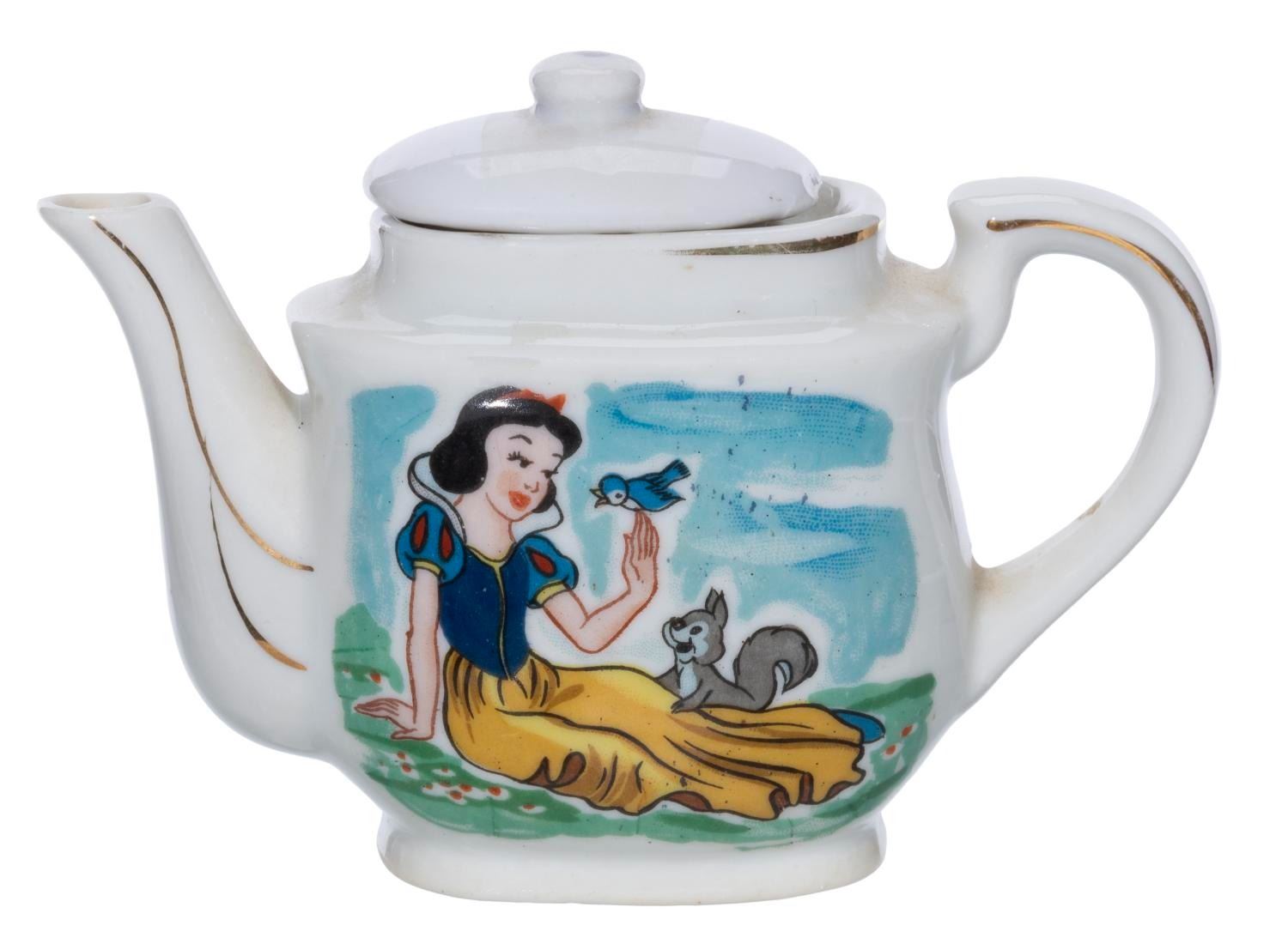 MARX, 1930s) A Walt Disney's Snow White and the Seven Dwarfs Tea Set by Louis MARX & Company. The 13 piece set includes 4 plates, 4 tea cups, 4 saucers, and 1 teapot. The saucers measure 3.5" and plates 3.75" in diameter. The cups are 2.25" in diameter and 1.25" tall, and the teapot is 5"x4". The teapot may have a mis-matched lid as it has silver leaf instead of gold. Each piece is in very good condition with a few minor scuffs and wear to their surfaces and gold-toned edging.