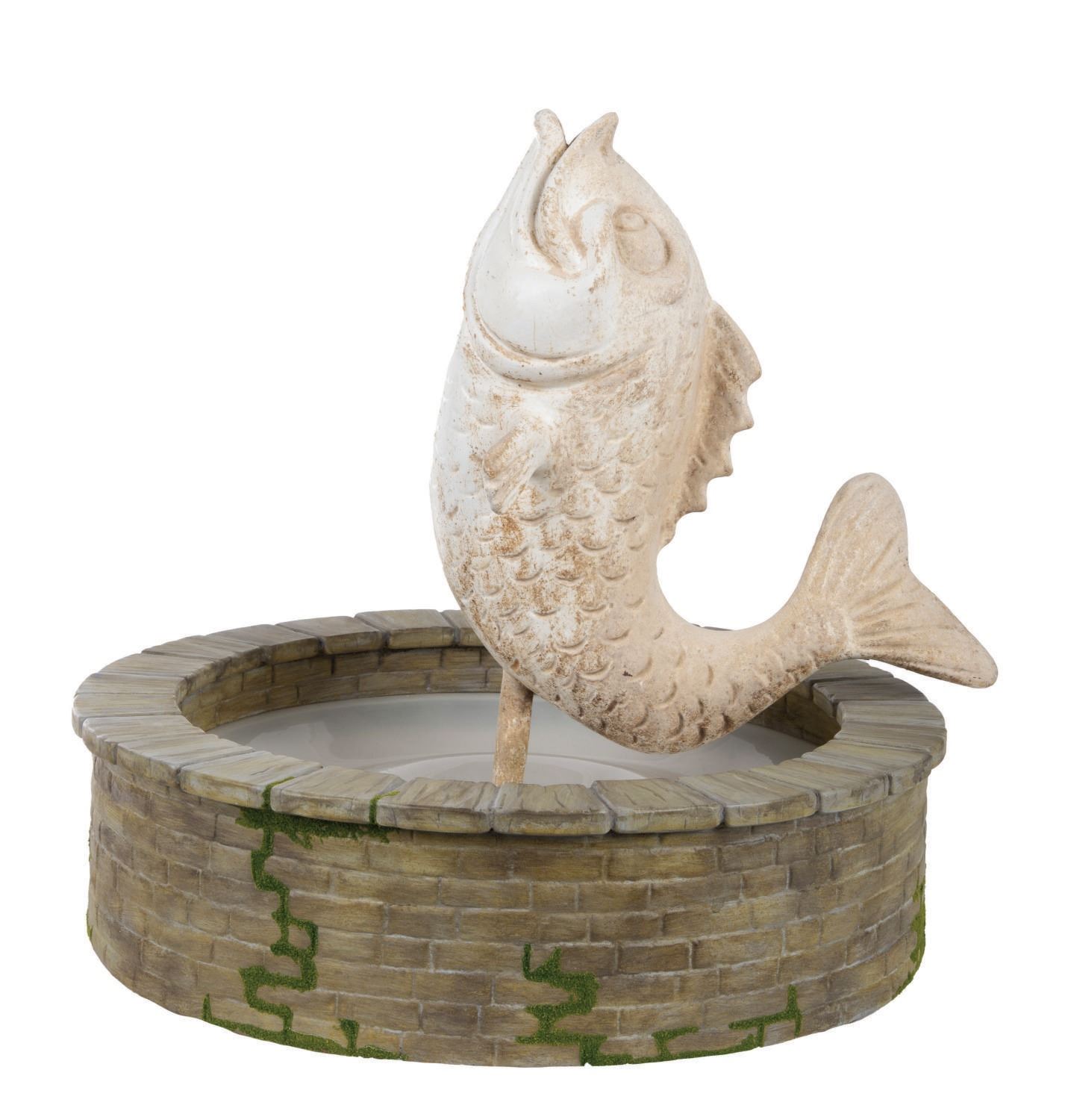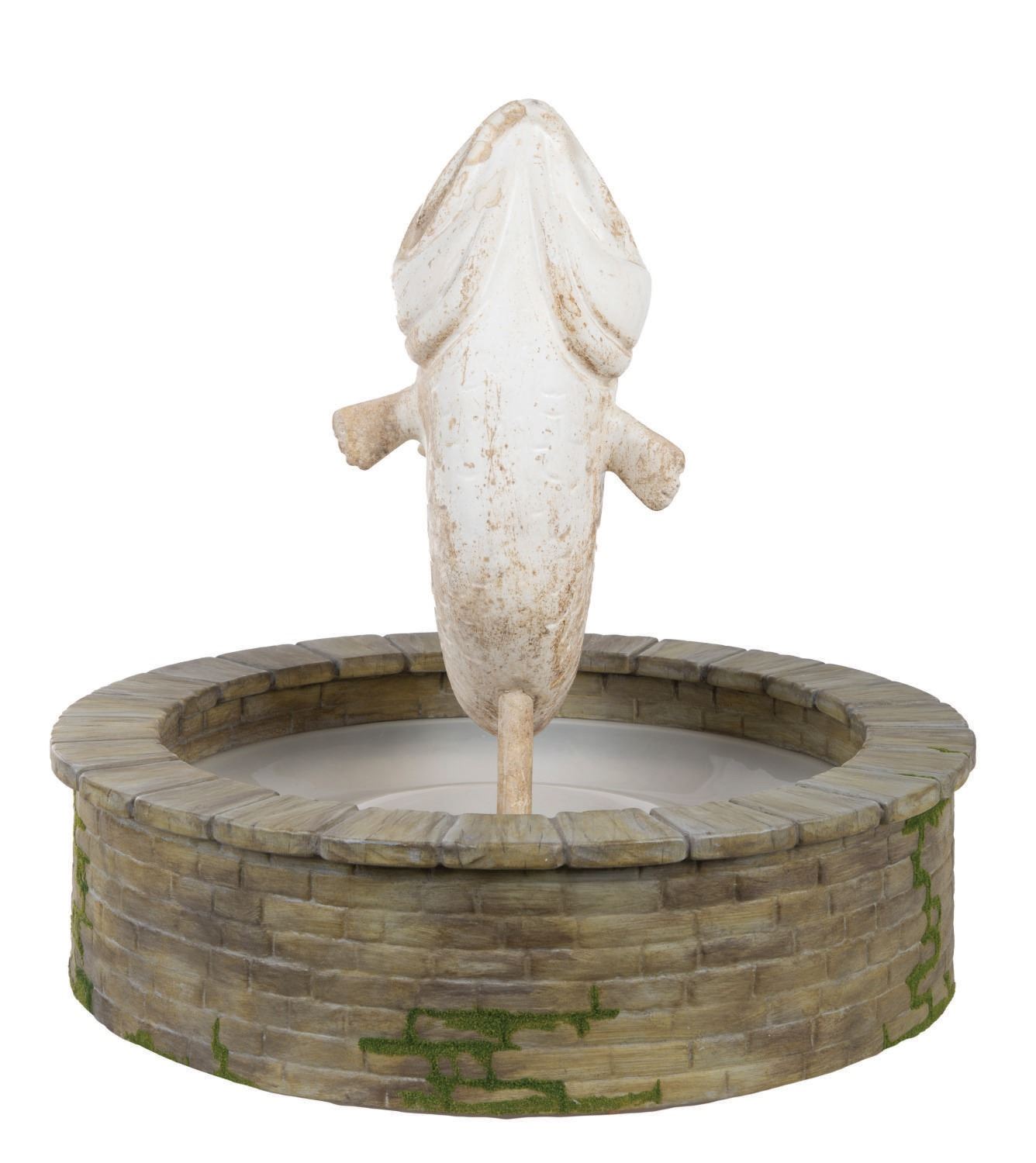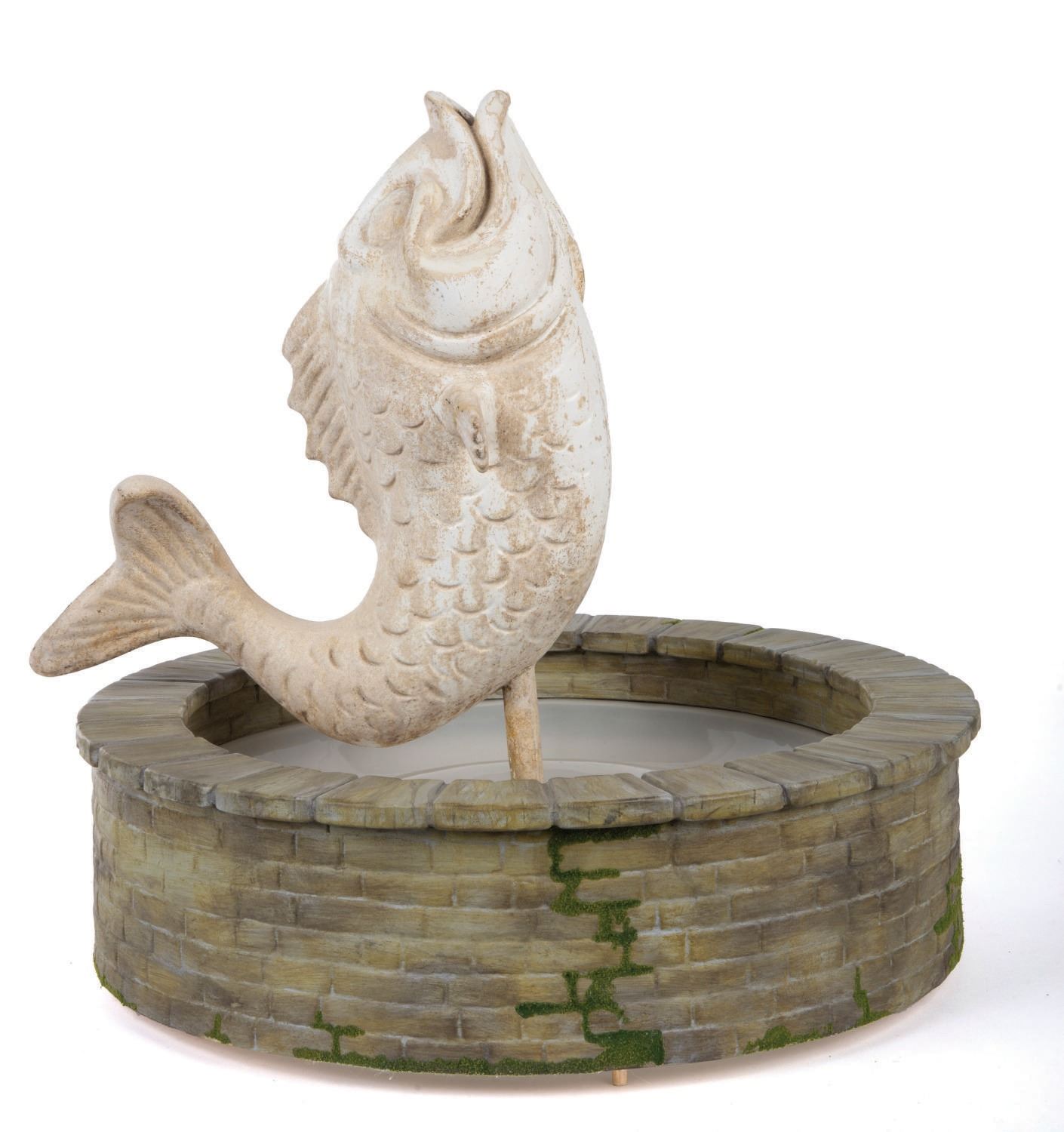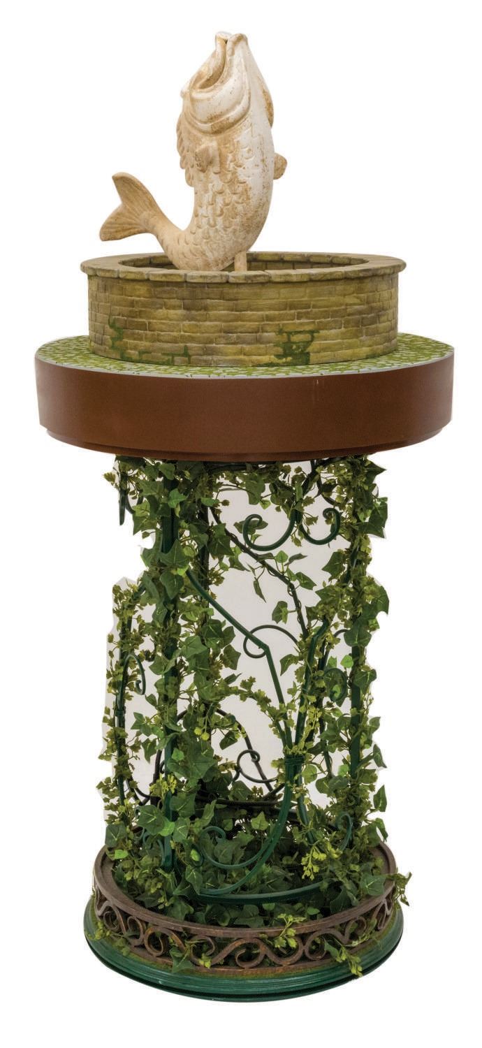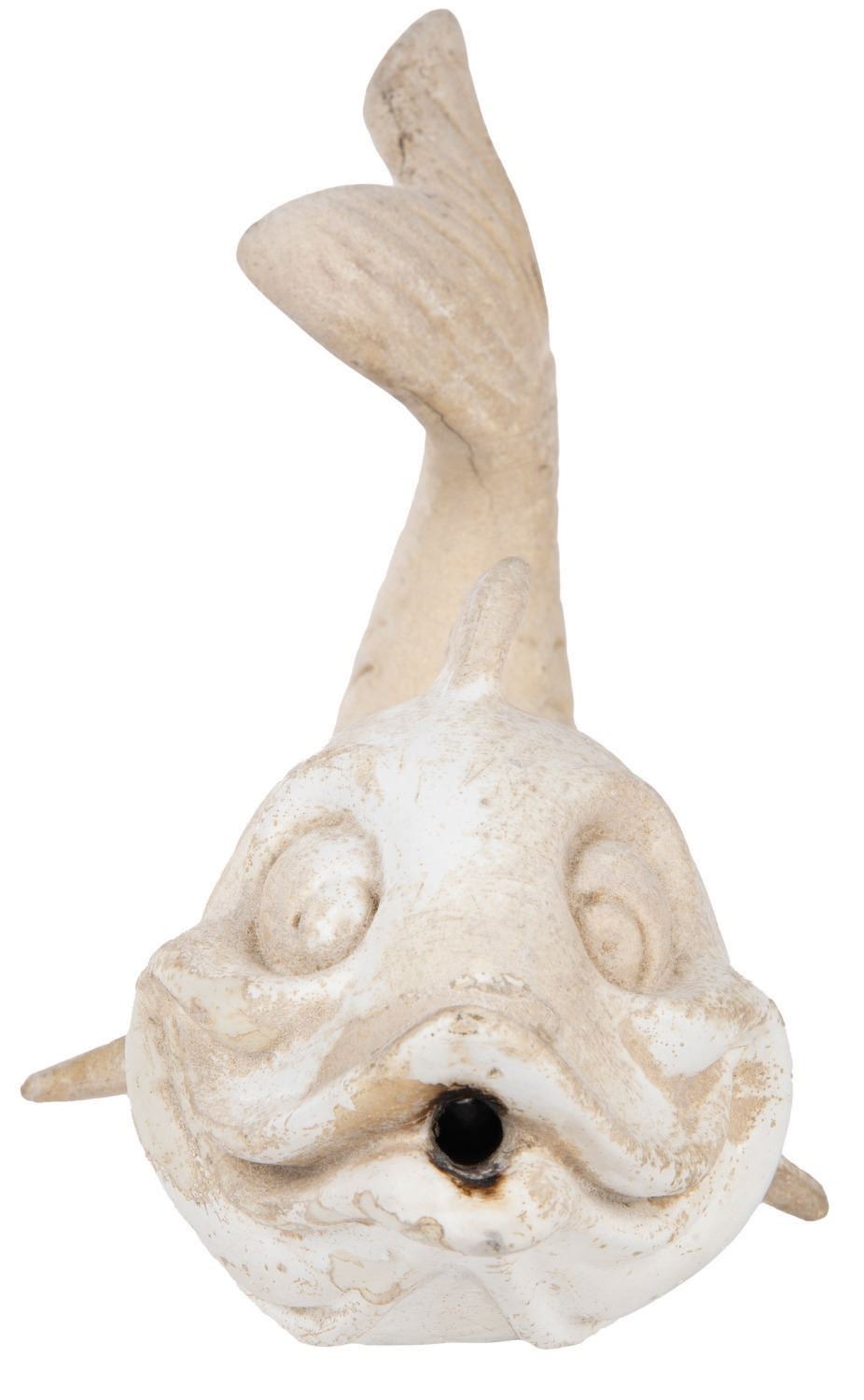 (Disneyland, 1970s) A fish fountain figure from Snow White's Grotto at Disneyland. Snow White's Grotto was dedicated April 9, 1961. This fiberglass fish figure was part of the rotating fountain that appears during the show. Measuring approximately 14.5" long and 7" wide, the figure comes with a custom fountain display base measuring 17" in diameter and 4.5" tall. The fish prop is in good, park-used condition.