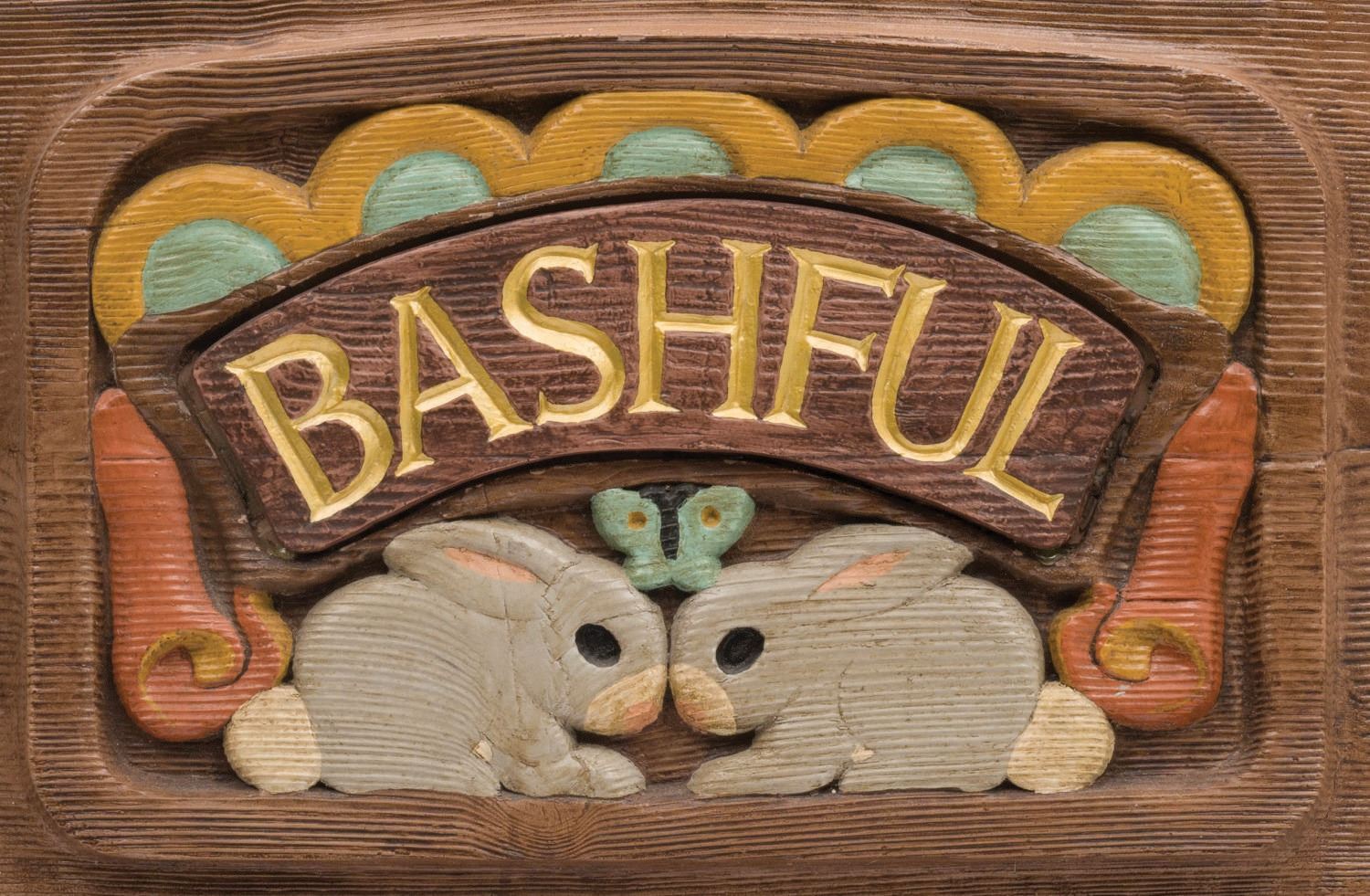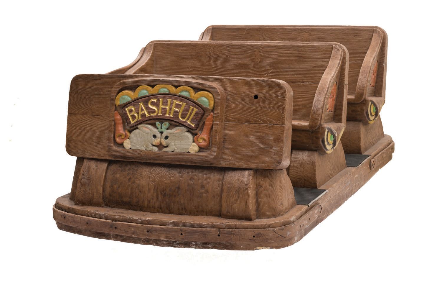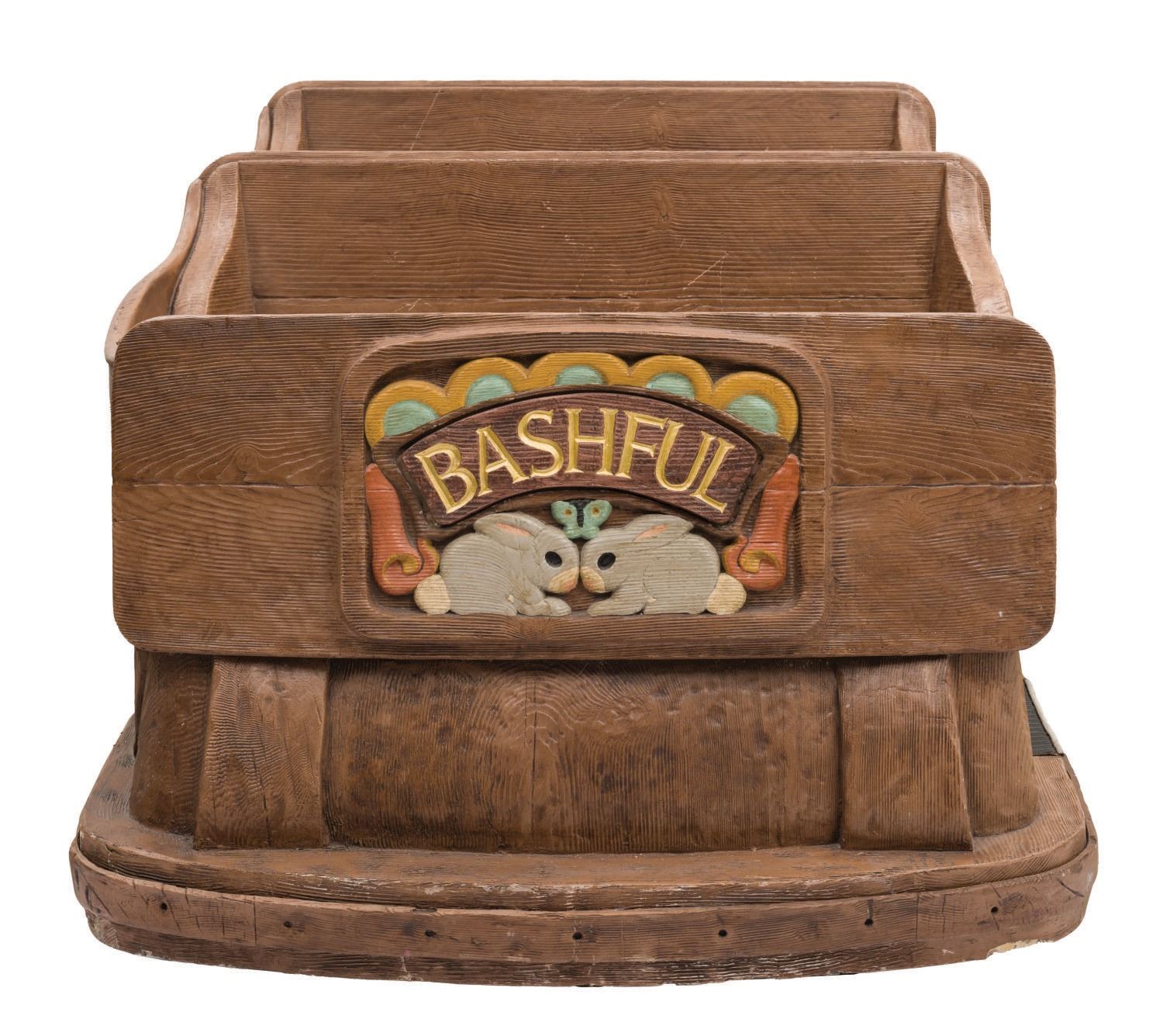 (Walt Disney World, c.1980s) An original attraction vehicle from "Snow White's Scary Adventures" at Walt Disney World. Constructed of fiberglass with a metal frame, this vehicle was designed to appear to be made of wood and features "carved" woodland critters around the sides. One of the charming aspects to these vehicles is the name plate that features the name of Snow White or one of the seven dwarfs. The front of this vehicle reads "Bashful" along the nameplate in a similarly decorated style to the rest of the vehicle. Measuring 36" tall, 78" long, and 50" wide, this vehicle is in good condition with some wear throughout from its use and removal. Special shipping arrangements will apply. Please inquire before bidding.