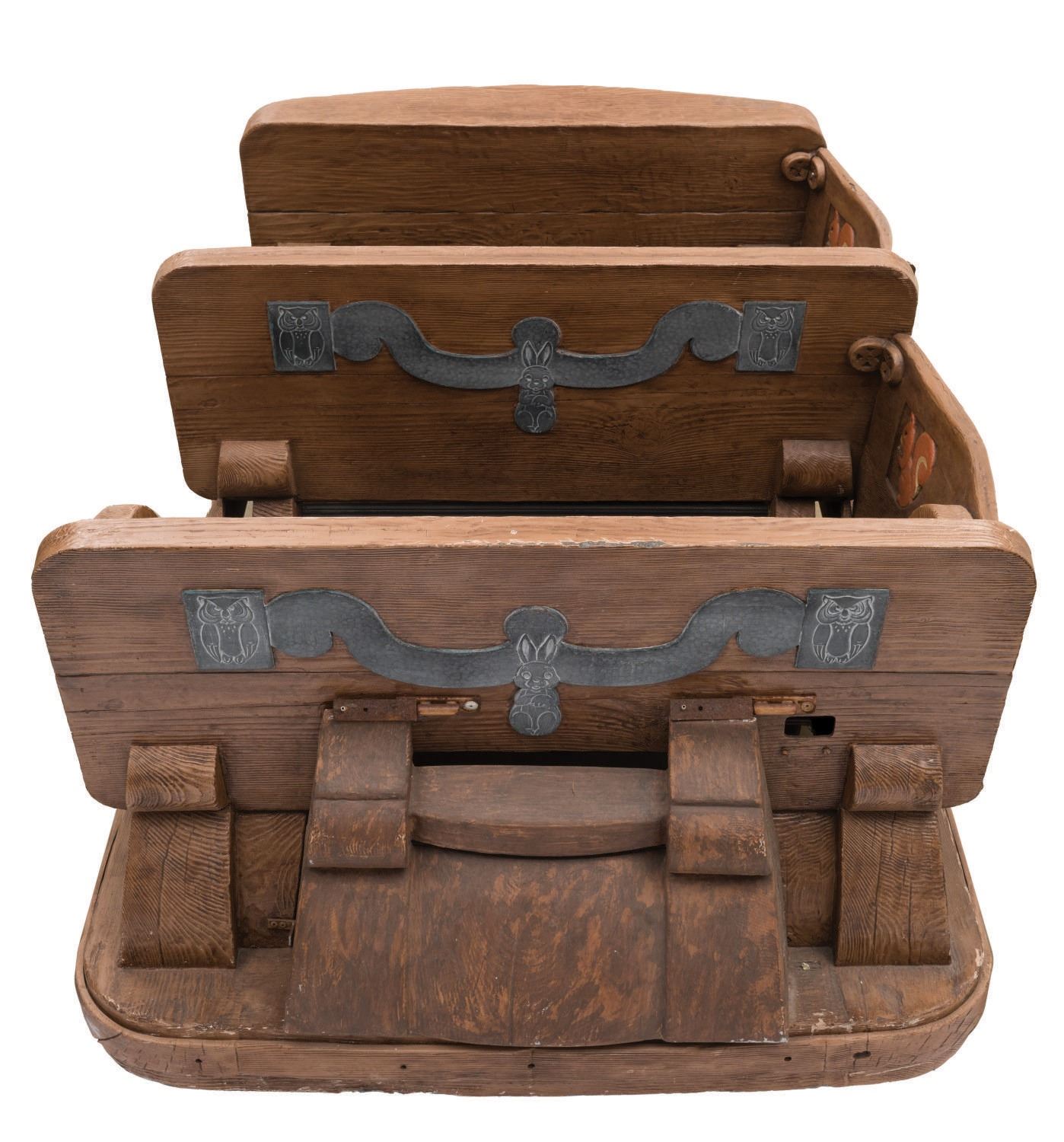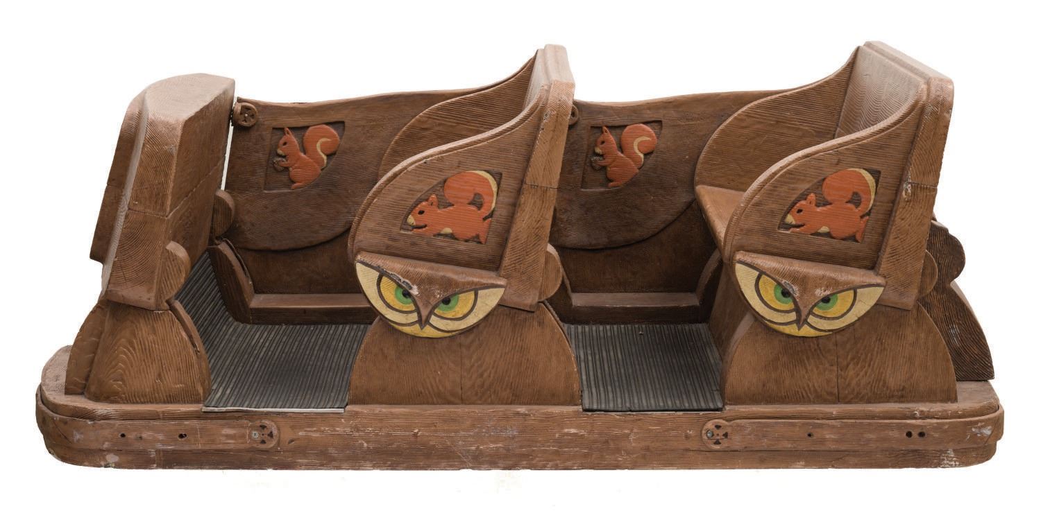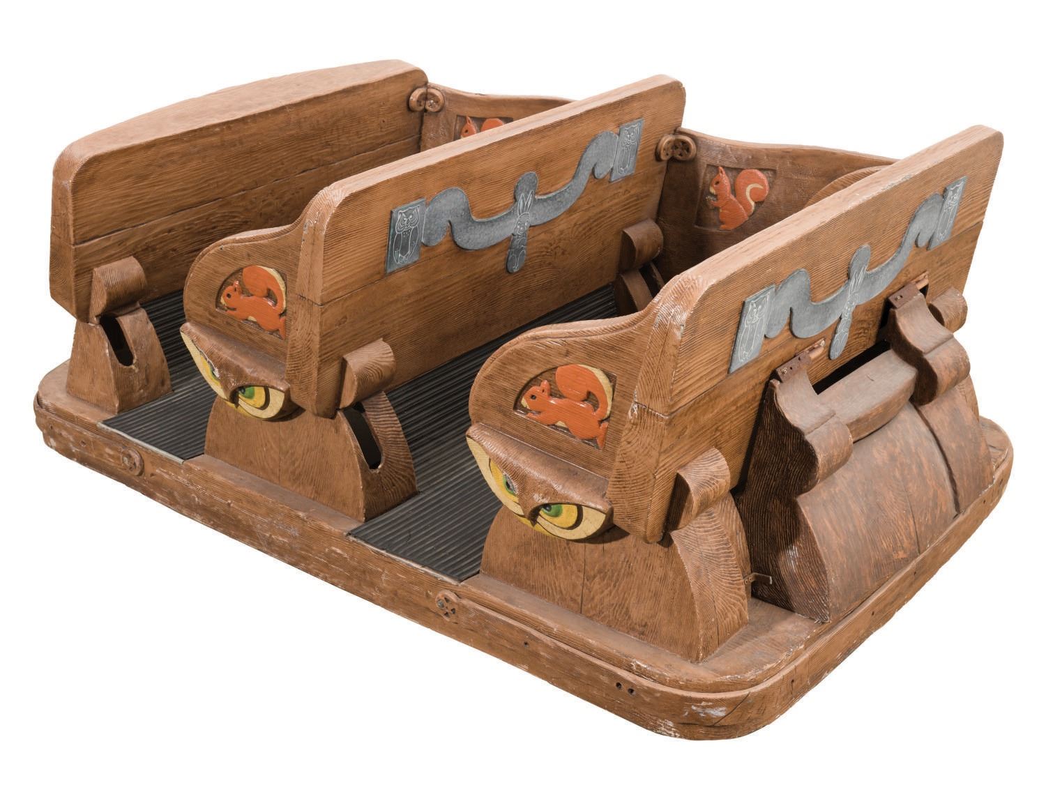 (Walt Disney World, c.1980s) An original attraction vehicle from "Snow White's Scary Adventures" at Walt Disney World. Constructed of fiberglass with a metal frame, this vehicle was designed to appear to be made of wood and features "carved" woodland critters around the sides. One of the charming aspects to these vehicles is the name plate that features the name of Snow White or one of the seven dwarfs. The front of this vehicle reads "Bashful" along the nameplate in a similarly decorated style to the rest of the vehicle. Measuring 36" tall, 78" long, and 50" wide, this vehicle is in good condition with some wear throughout from its use and removal. Special shipping arrangements will apply. Please inquire before bidding.