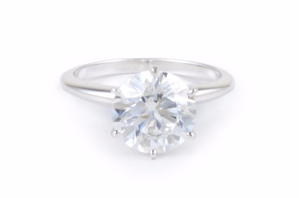 Featuring a solitaire round brilliant-cut diamond,mounted on a classic Tiffany-style 18K white gold shank; diamond isGIA-certified as a 2.97-carat brilliant-cut diamond with G color and VS2 clarity; ring size 5-3/4; weight 3.6g.