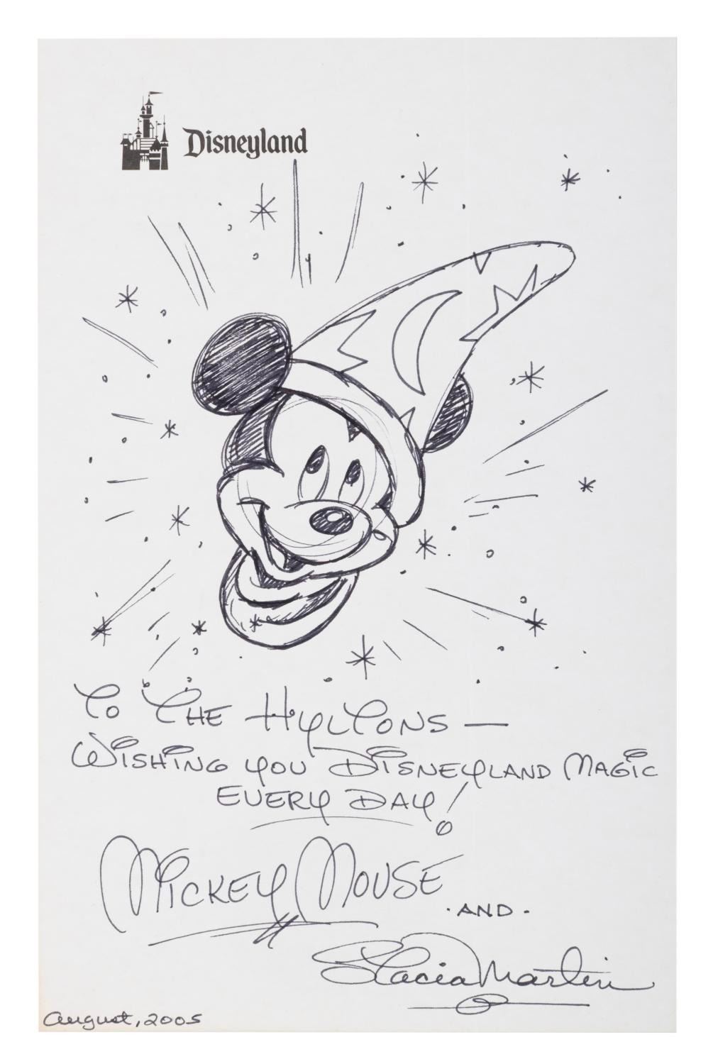 (Disneyland, 2005) An ink drawing of Sorcerer Mickey on Disneyland stationery by Disney artist and historian, Stacia Martin, signed with a dedication “To The Hyltons.” Martin is a Disney artist and historian known for illustrating books and designing collectibles, and is recipient of both the Walt Disney Legacy and Disney “Archives Angels” awards. Measuring 8.5” x 5.5”, the drawing is in very good condition with a very light crease running the vertical length of the paper.