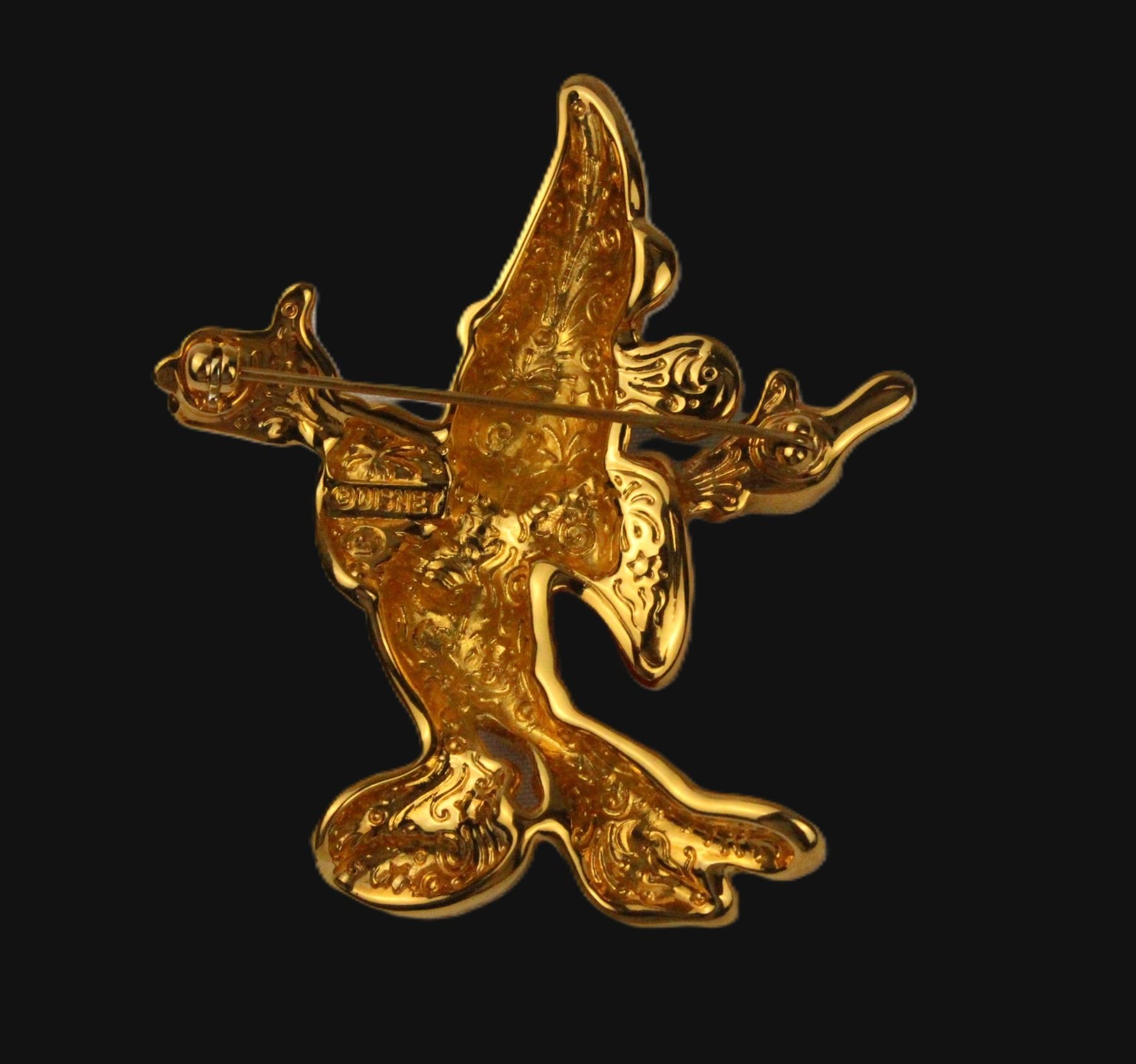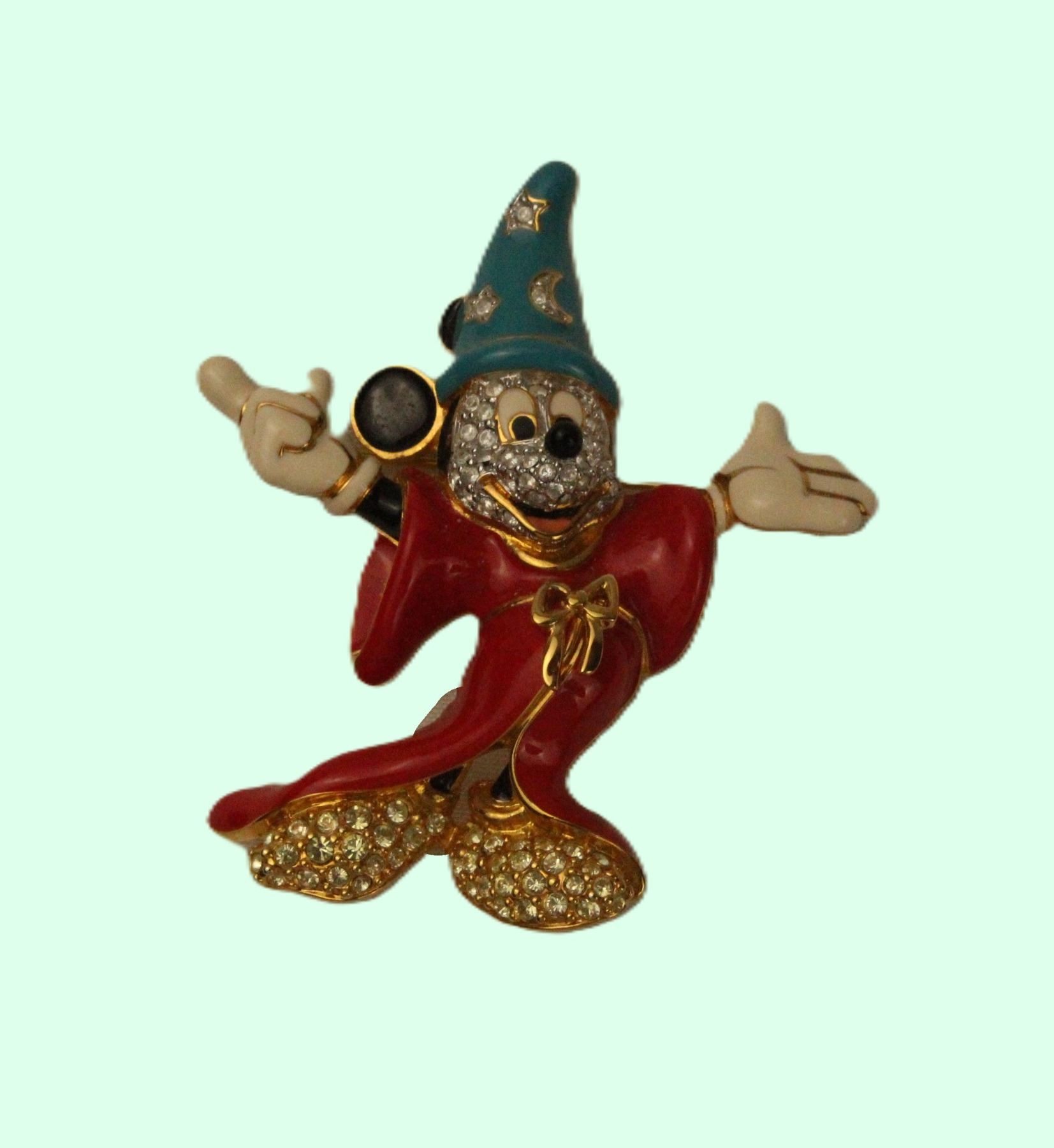 (Disney/Swarovski, 2000s) This beautiful Swarovski limited edition brooch of Sorcerer Mickey features high-gloss enamel and clear white Swarovski crystals. The edition size is 1000. It measures 2.25” x 2”. It is in fine condition with all stones intact.