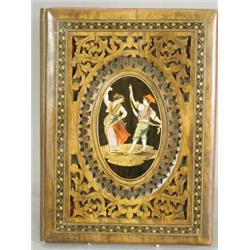 A Sorrento blotter with an inlaid panel within a fretwork border, the interior with stationery co...