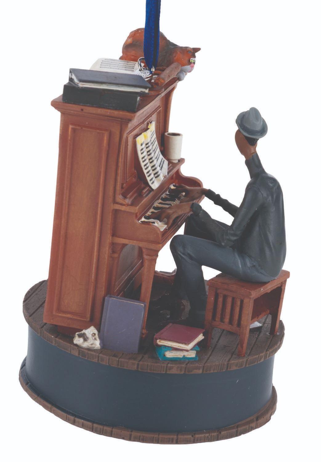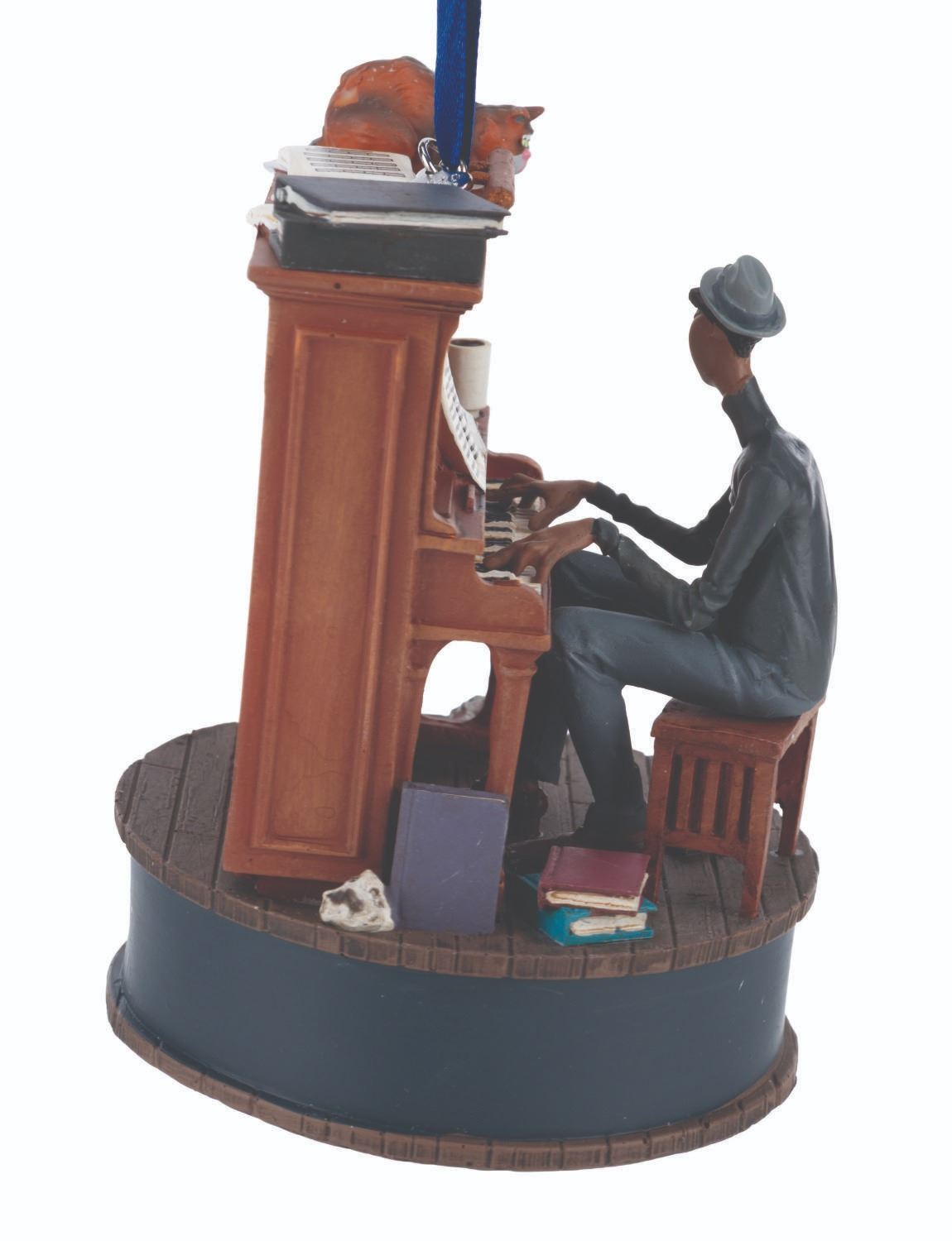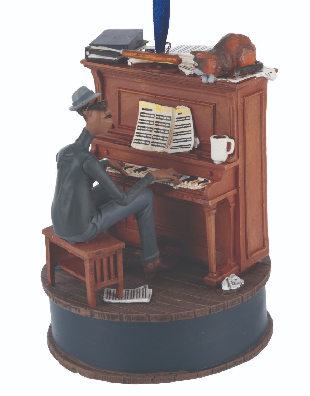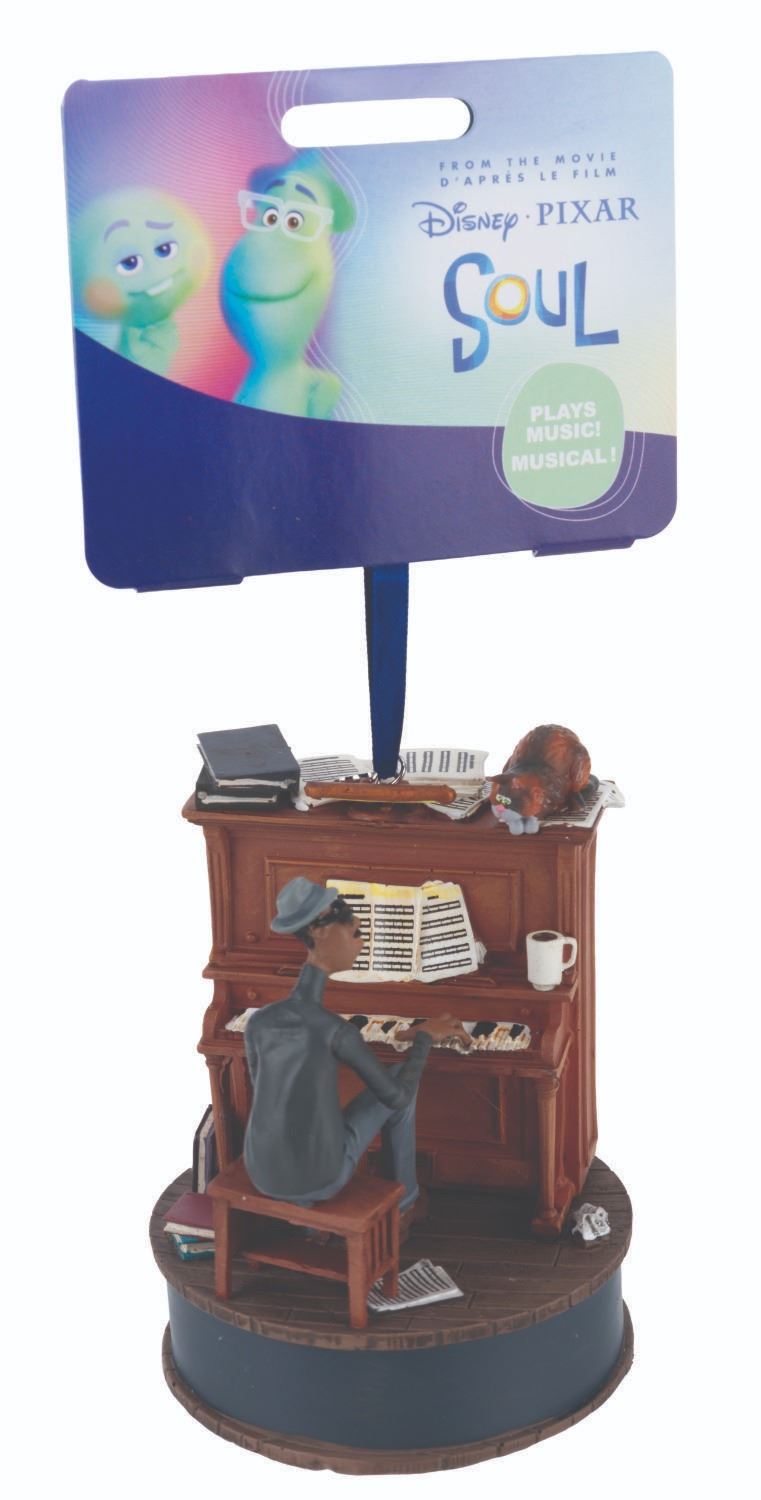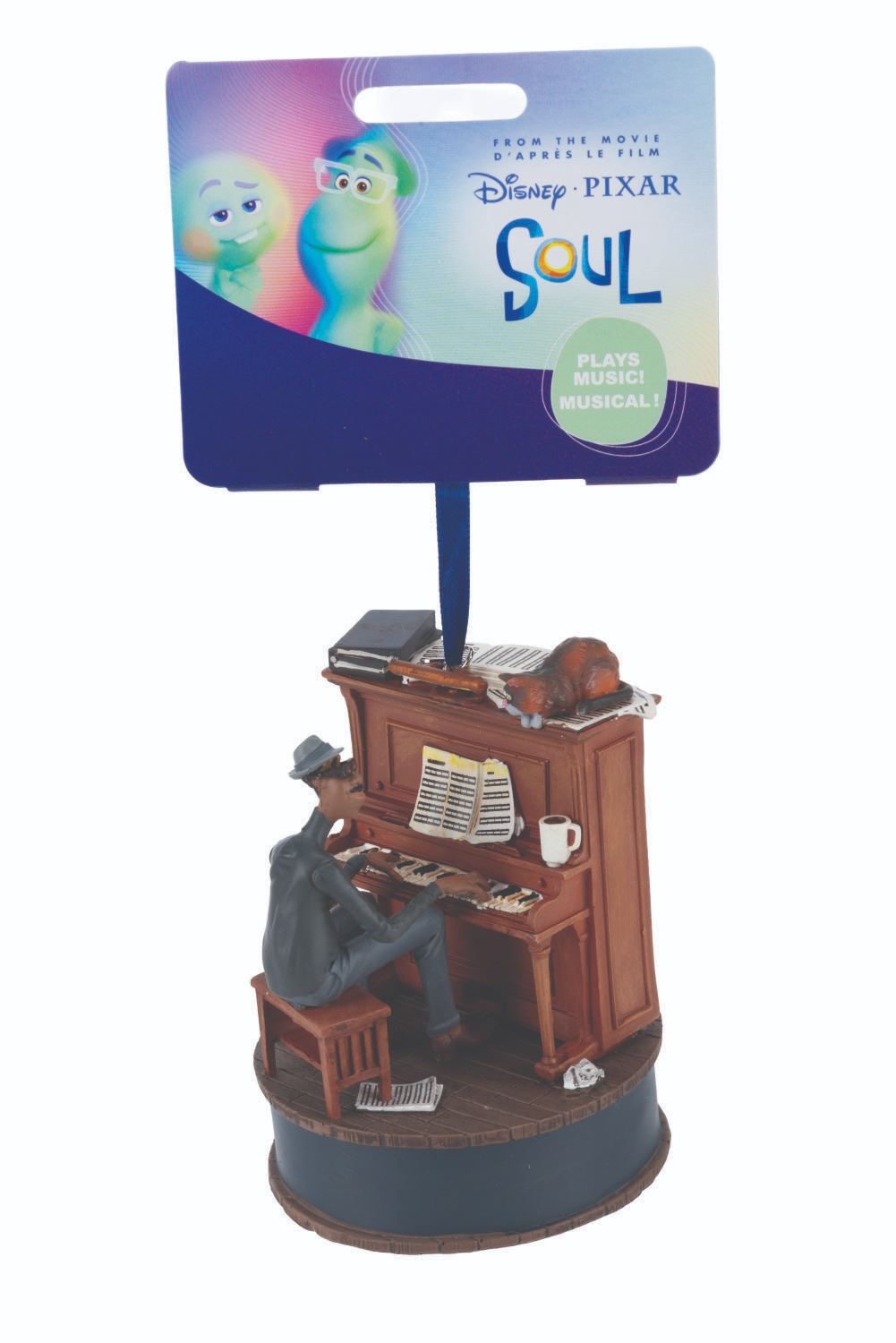 (Disney, 2020) An ornament of "Soul" featuring Joe playing the piano as Mr. Mittens listens in. The musical feature plays piano music, working when tested but requiring fresh batteries to play fully. The ornament is in fine, unused condition with the original box.