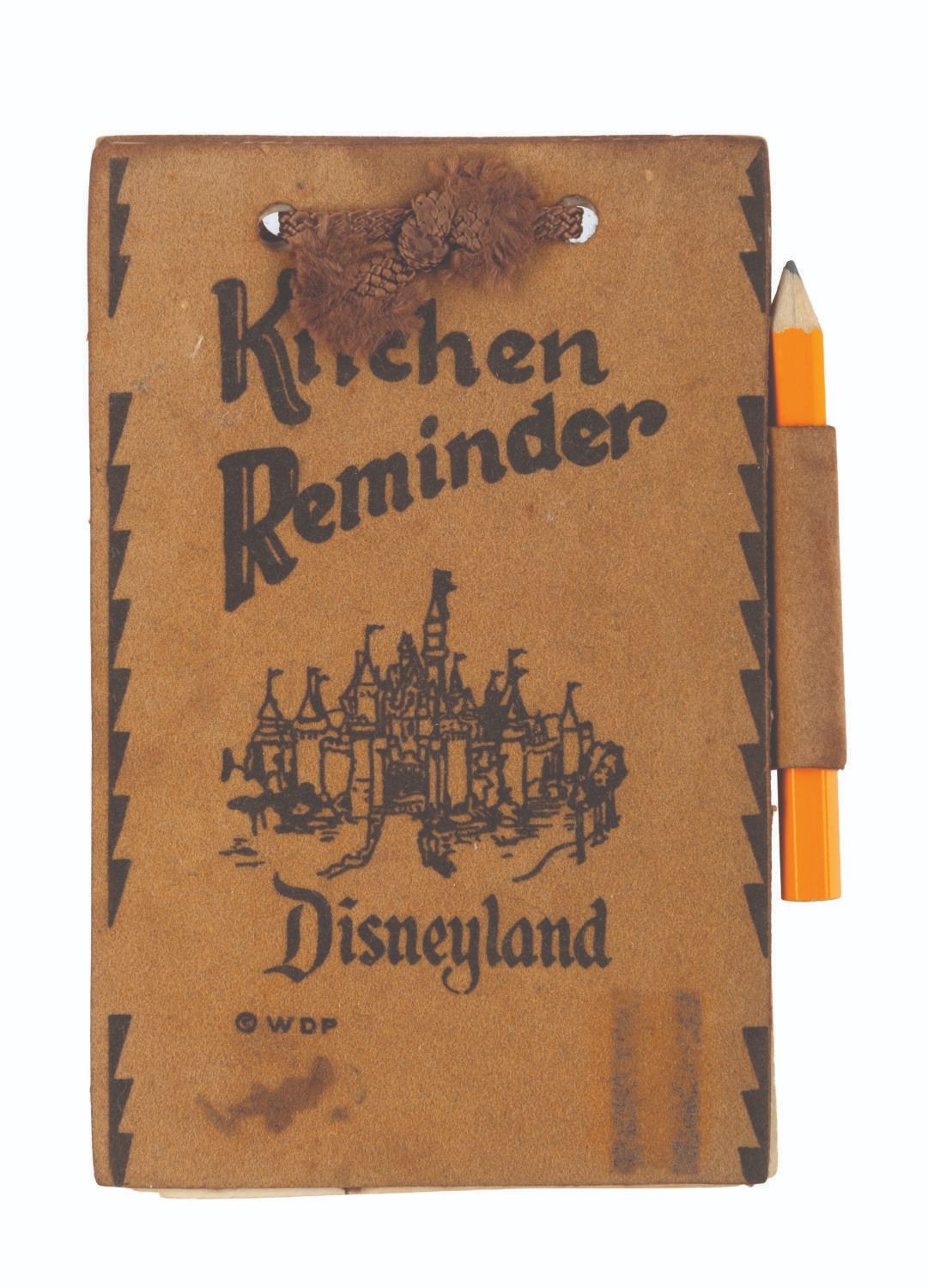 (Disneyland, 1950s) A souvenir kitchen reminder notepad featuring Sleeping Beauty Castle on the cover. The pages inside are printed with standard grocery items. Measuring 3.75” x 5.25”, the notepad is in very good condition with some wear and spotting to the cover.
