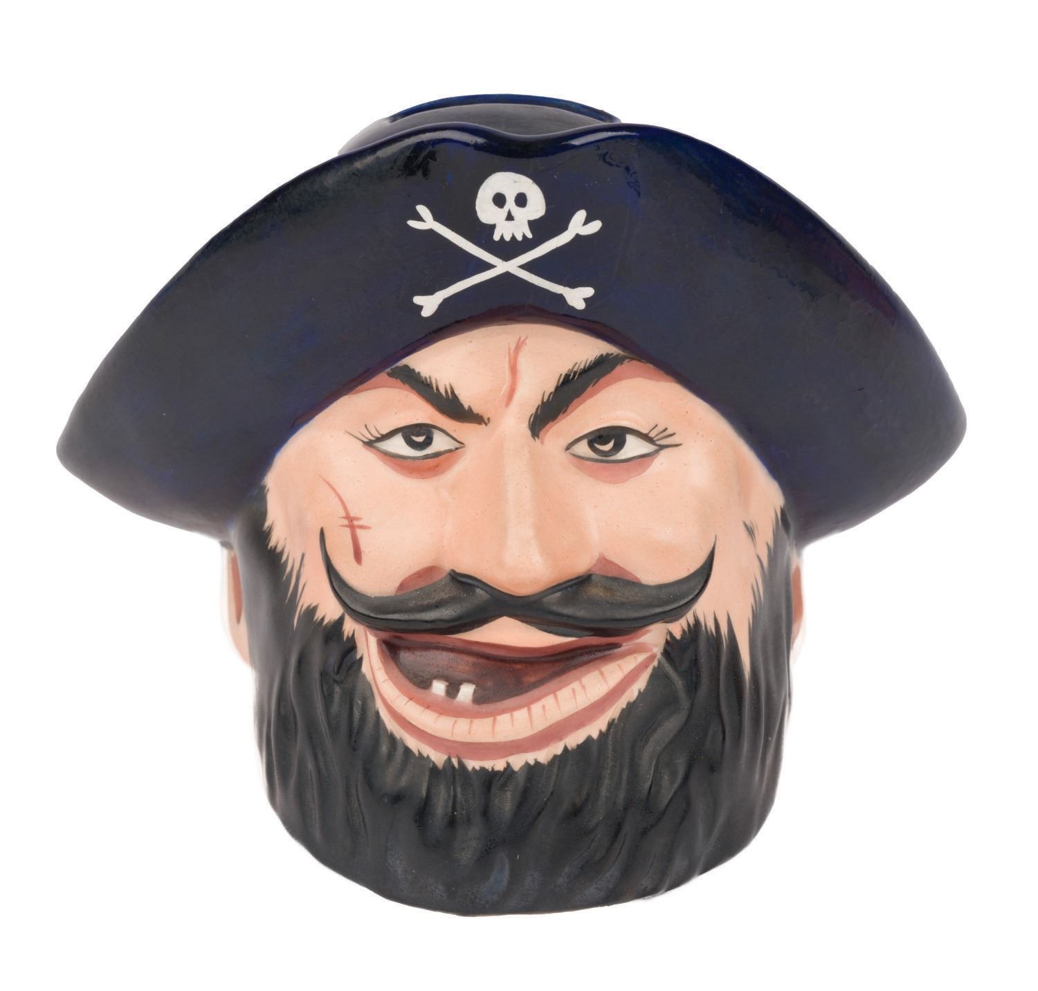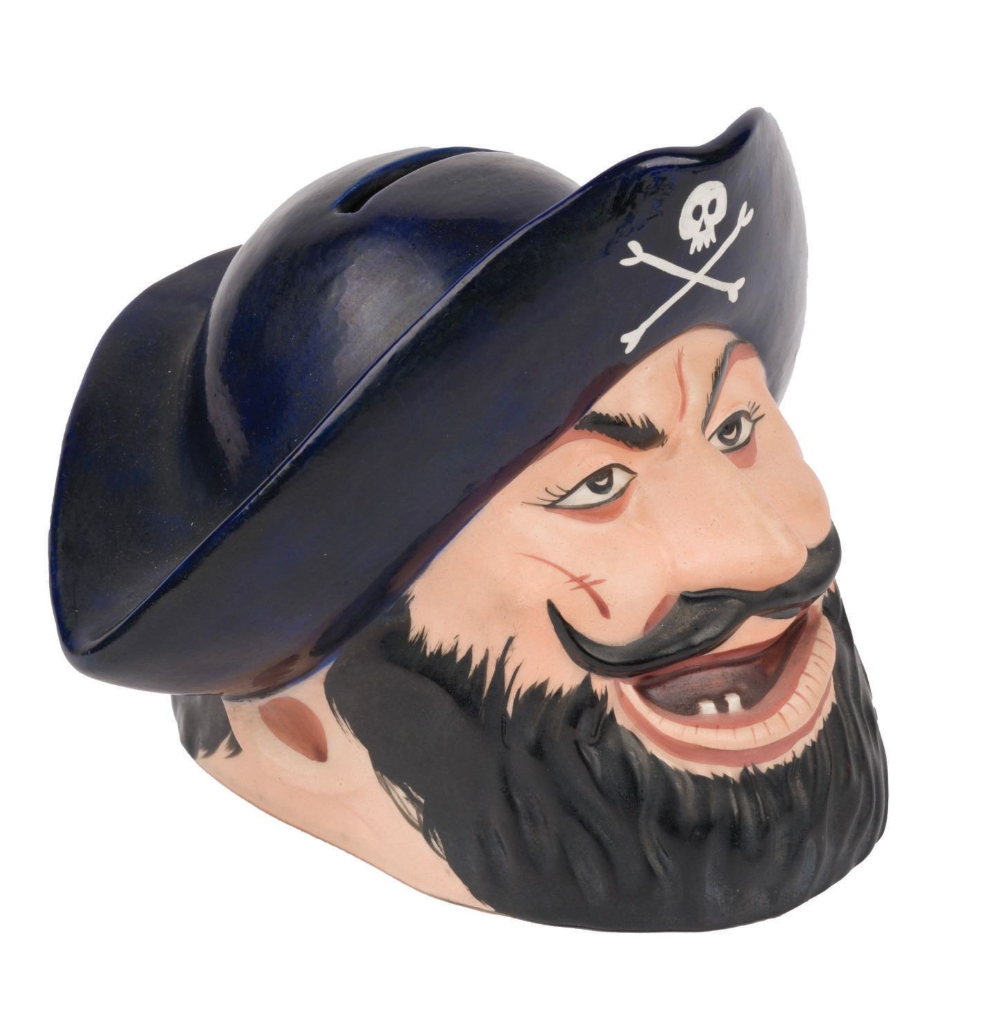 (Disneyland, 1967-70s) A hand-painted ceramic bank inspired by the wild crew members of Pirates of the Caribbean at Disneyland. The Pirate Captain bank with original rubber plug was manufactured by Price Imports of Japan and was a popular souvenir within New Orleans Square around the adventure's opening. Measuring approximately 4.5" tall and 4.5" at its widest diameter, the piece displays in very good condition with few signs of crazing to glaze and wear.