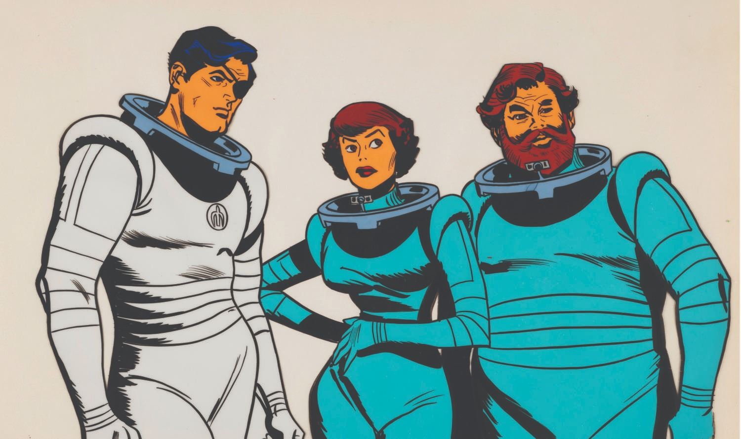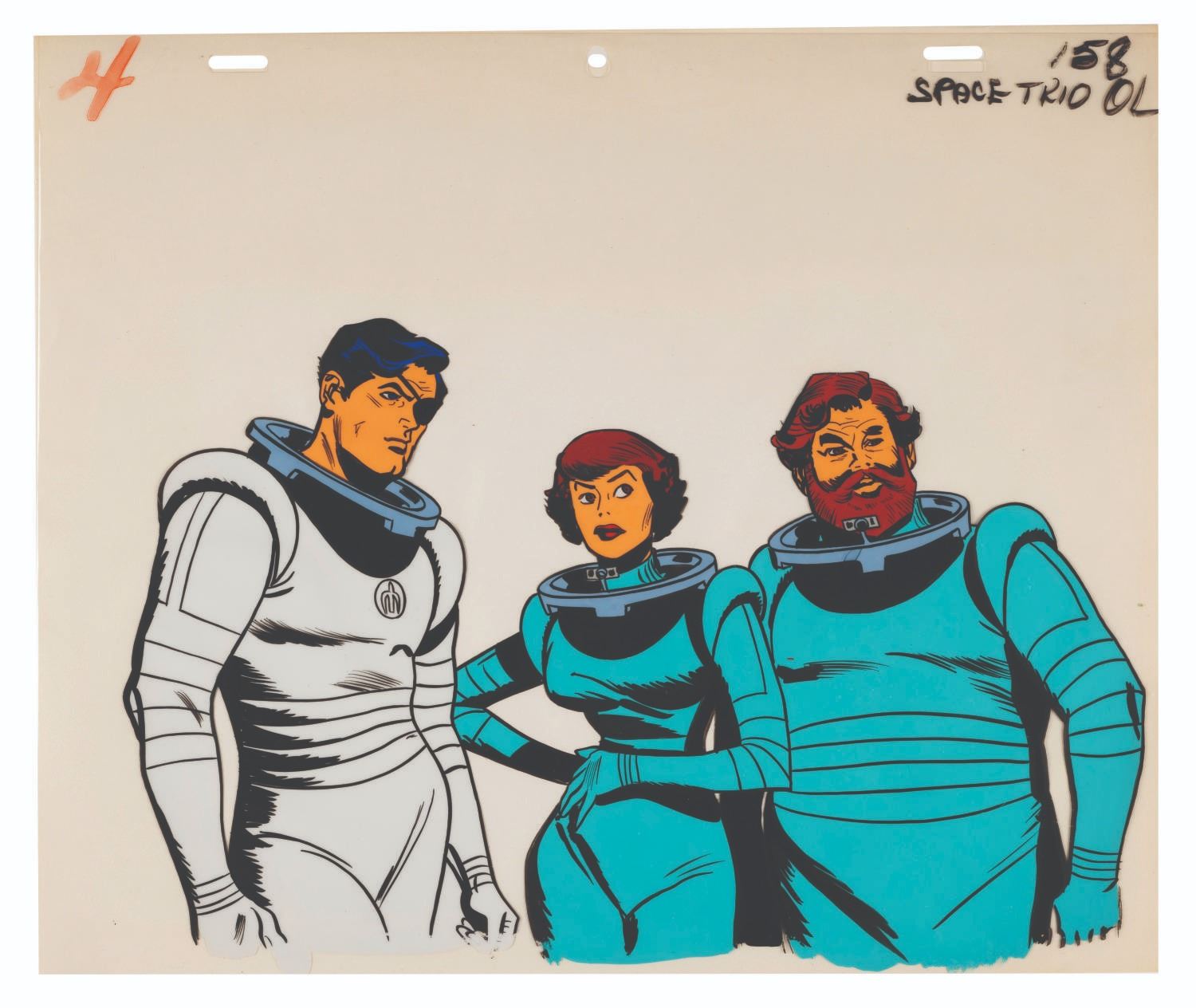 (Cambria Productions, 1962-64) An original hand-painted production cel of Space Angel, Crystal Mace, and Taurus, from the science-fiction TV series “Space Angel.” With a character image size of 11.5” x 7” on a 10.5” x 12.5” cel, the piece is in fine condition.
