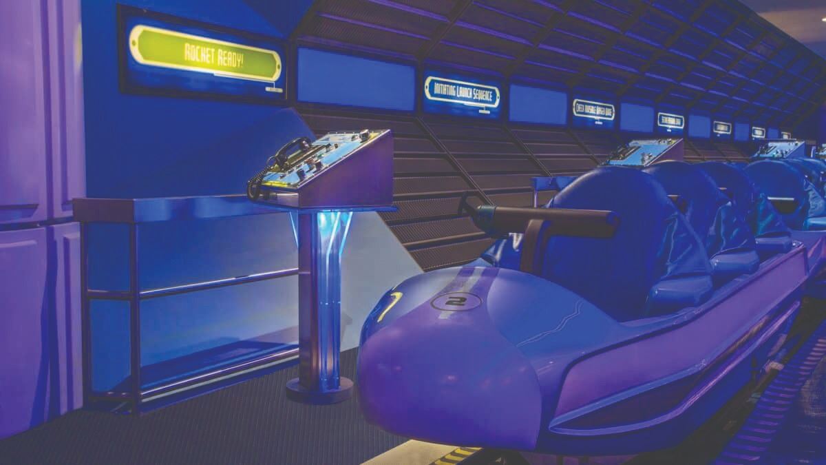 (Walt Disney World, 1975) A Space Mountain ride vehicle from Walt Disney World. Opening in 1975, Space Mountain was one of the first attractions to premiere at Walt Disney World before moving to Disneyland, like the Country Bear Jamboree before it. This vehicle preserves the original body and interior of a three-seat Space Mountain Rocket, on a custom recreated chassis. Rocket Number 23 measures 114"x37.5"x38" high and is in good condition with typical wear from Park use including crazing to the finish, scuffs particularly to seat backs, and wear to vinyl seats. Due to size and weight, special shipping arrangements are required. Please inquire before bidding.