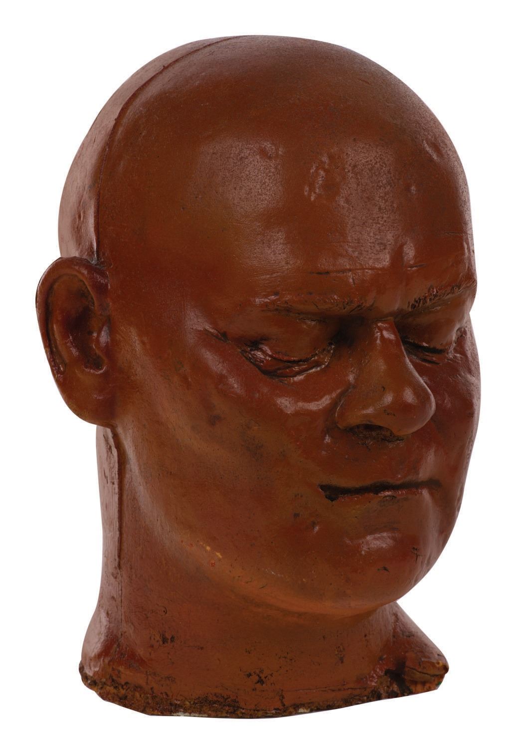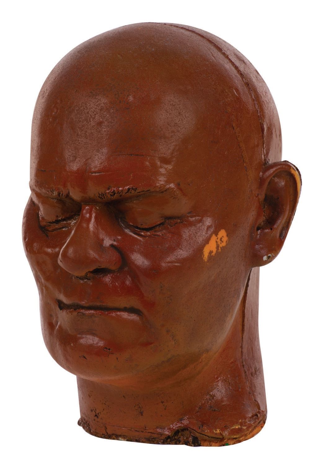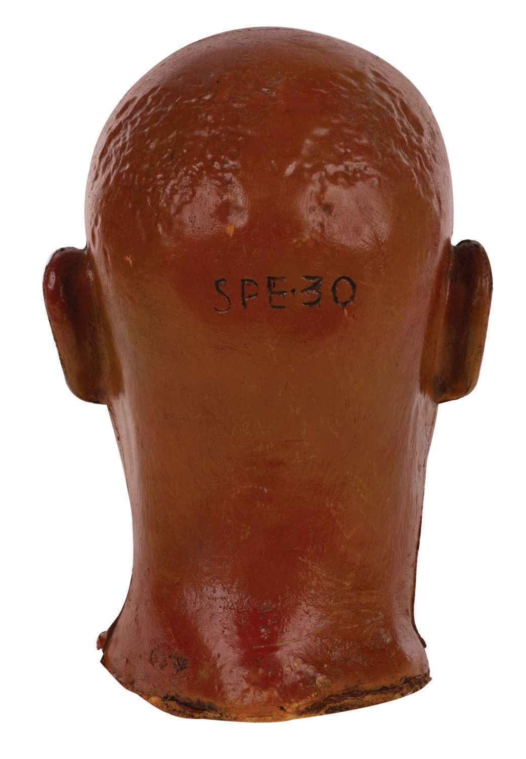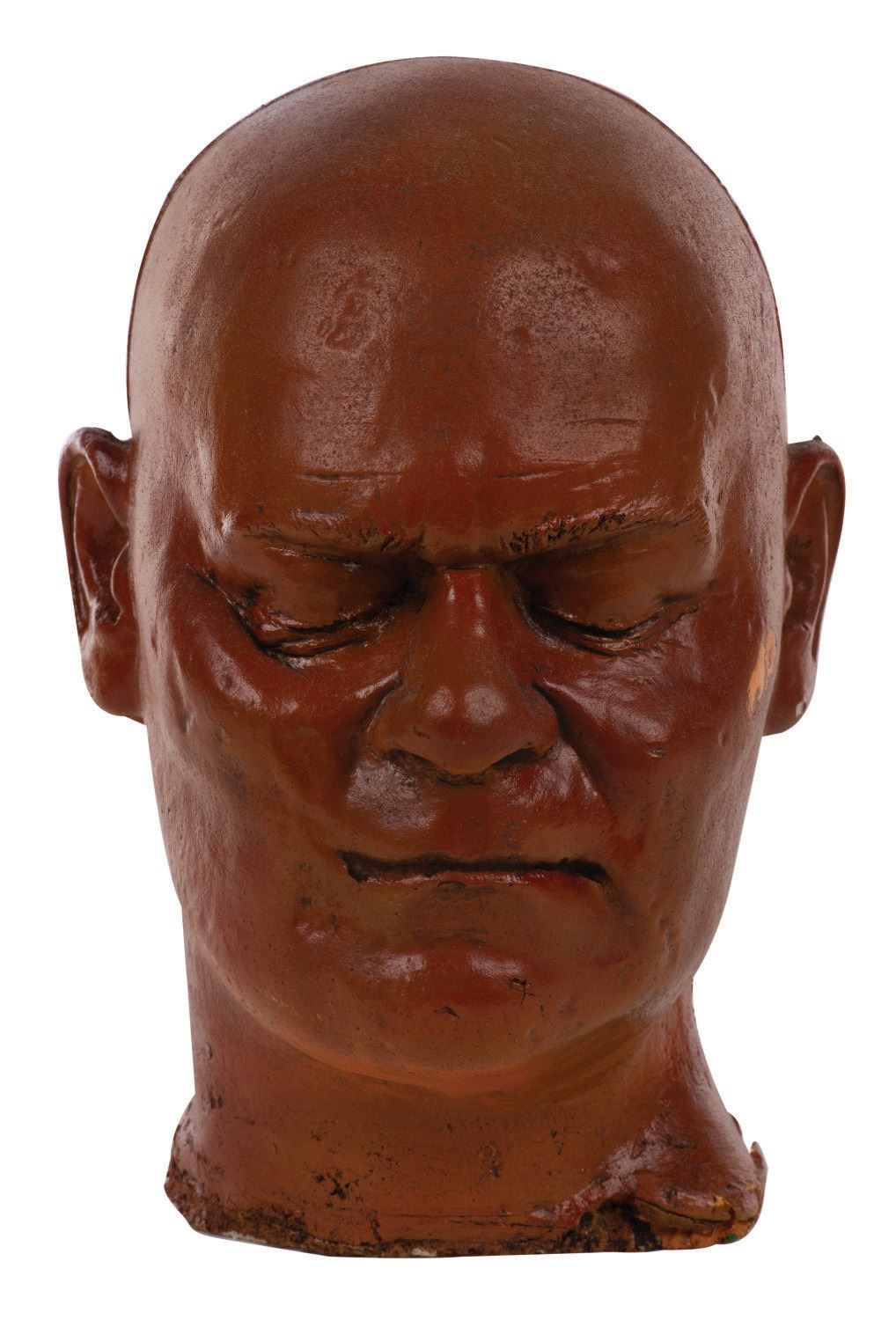 (EPCOT, 1980s) A Master Pull head prepared for an Audio-Animatronics sleeping monk figure of Spaceship Earth. This piece was used in testing the paint and surface of the memorable character and has "SPE30" embossed on the back of the head. Measuring 11" tall, 7.5" at its widest diameter, and 9" deep, the foam piece displays in very good condition, with only minor handling wear.