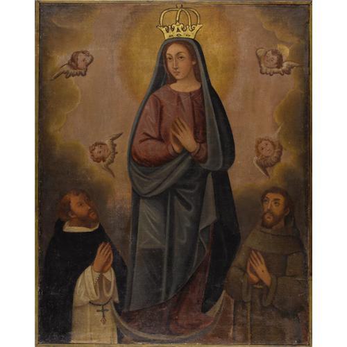 <B>A Spanish Colonial Painting of the Virgin Mary</B></I><BR><BR>Unknown artist, Spanish<BR>19th Century<BR>41.2 inches x 32.75 inches<BR><BR>The Virgin Mary is depicted wearing a crown and being admired by Saint Francis and Saint Dominic. <B>Condition Report:</B> Canvas has been relined and shows normal signs of wear as appropriate with age<BR><BR><b>Shipping:</b> Requires 3rd Party Shipping (<a target="_blank" href="http://www.heritageauctions.com/common/shipping.php">view shipping information</a>)