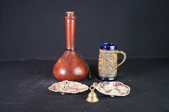 A Spanish Wine Bottle, A Water Cup, Two Small Dishes and a Copper Bell.