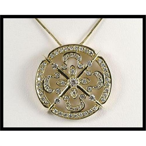 This shiny and beautiful filigree design 14K yellow gold round shape pendant contains with 73 full cut diamonds weighing approximately 1.00 carat total. The pendant weights 6.10 grams and the measurement is 0.92 inches by 0.94 inches. Chain is not included.