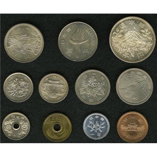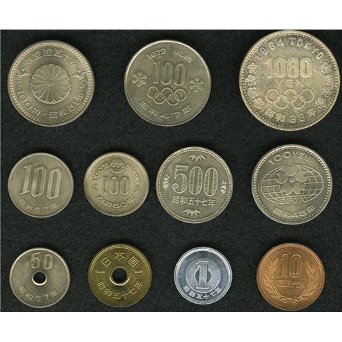 <B>A Special Presentation Set of Japanese coin as follows:</B></I> 1 Yen 1982, KM-Y74; 5 Yen 1982, KM-Y72a; 10 Yen 1982, KM-&73a; 50 Yen 1982, KM-Y81, 100 Yen 1982, KM-Y82; 100 Yen 1970, KM-Y83; 100 Yen 1972, KM-Y84; 100 Yen 1975, KM-Y85; 100 Yen 1976, KM-Y86; 500 Yen 1982, KM-Y87; and a 1000 Yen 1964, KM-Y80. The 10 Choice UNC coins in a white satin lined, red velvet case inscribed, MINISTER OF FINANCE- MICHIO WATANABE- GOVERNMENT OF JAPAN. This set was supposedly presented to John Balles, who met with Minister Watanabe on June 9, 1982 at the Mark Hopkins Hotel in San Francisco. We have never seen another set in a case such as this.
