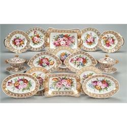 A Spode porcelain part dessert service, painted with a bouquet of flowers within gilt borders, comprising; two sauce tureens, covers and stands, three two-handled shaped rectangular dishes, four lozenge-shaped dishes, four scallop-shell dishes, two oval dishes and twenty plates, circa 1820 (some old repairs and restoration)