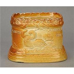 A Staffordshire brown saltglazed stoneware shaped rectangular commemorative paste-pot or tobacco jar, moulded in relief with classical scenes and inpressed KERRY BRIDGE and dated 1828, 13.5cm wide (cracked, lacks cover) (see illustration) £50-70