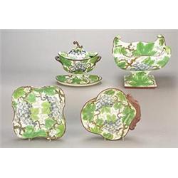 A Staffordshire pearlware part dessert service, printed in manganese and painted in green and brown with fruiting vine, comprising; a square pedestal bowl with turnover corners, a pair of sauce tureens, integral stands and cover, a pair of trefoil serving dishes, a quatrefoil serving dish and seventeen plates, circa 1810 (some damage and staining) (see illustration) £500-700