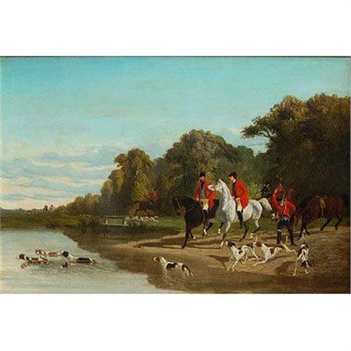 A Stag Hunt with hounds crossing a river, English School 19th Century, with signature</em></td>
