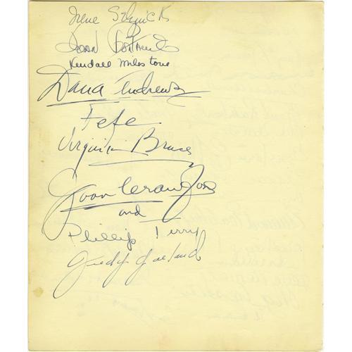 <B>A Star-Studded Party for the "Hostess with the Mostest" Elsa Maxwell</B></I> who once described herself as "... a short, fat, homely piano player from Keokuk, Iowa, with no money or background, [who] decided to become a legend and did just that." Though an actress, writer and composer, she was best known for the parties she threw (and attended). Maxwell was the first to sign this page from Clifton Webb's guest book as the guest of honor on June 17, 1944. The other signatures on the front and back of this page reads like a "Who's Who" of Hollywood and society of the day and includes (just to drop a few names): Basil Rathbone, Otto Preminger, Darryl F. Zanuck, Samuel Goldwyn Jr., Jack L. Warner, Gene Tierney, Judith Anderson, Gilbert Roland, Oleg Cassini, John Houseman, Joan Fontaine, Dana Andrews, Virginia Bruce, Joan Crawford and her third husband Phillip Terry, as well as Judy Garland. In very good condition with only very slight toning and wear to the edges. <I>With COA from PSA/DNA.</B></I>