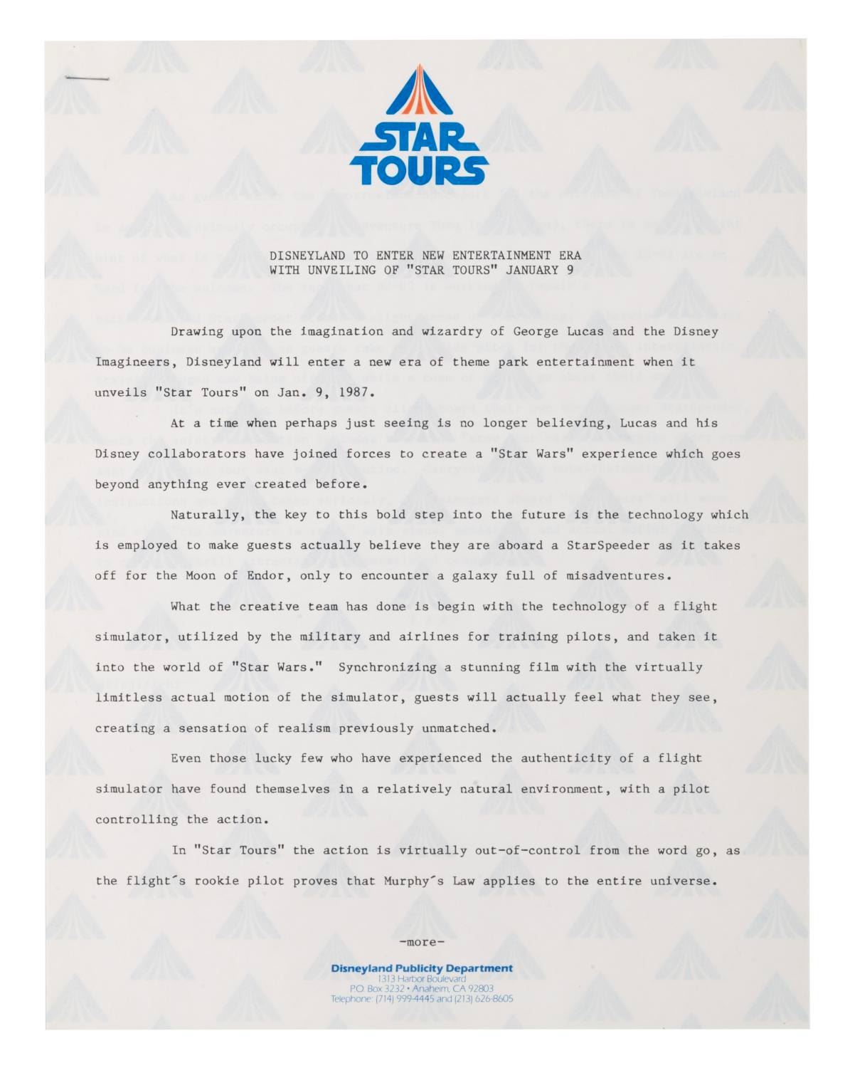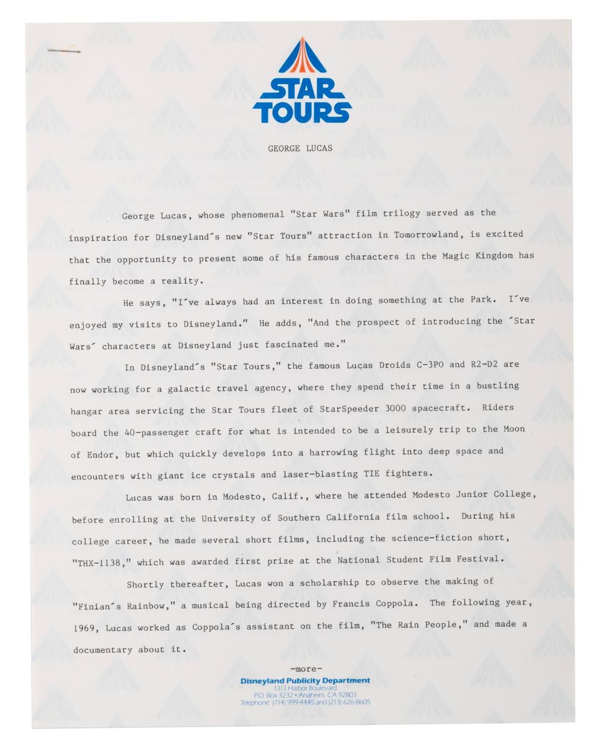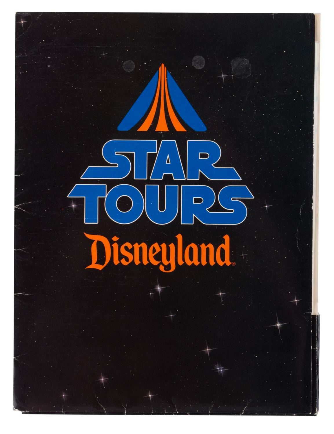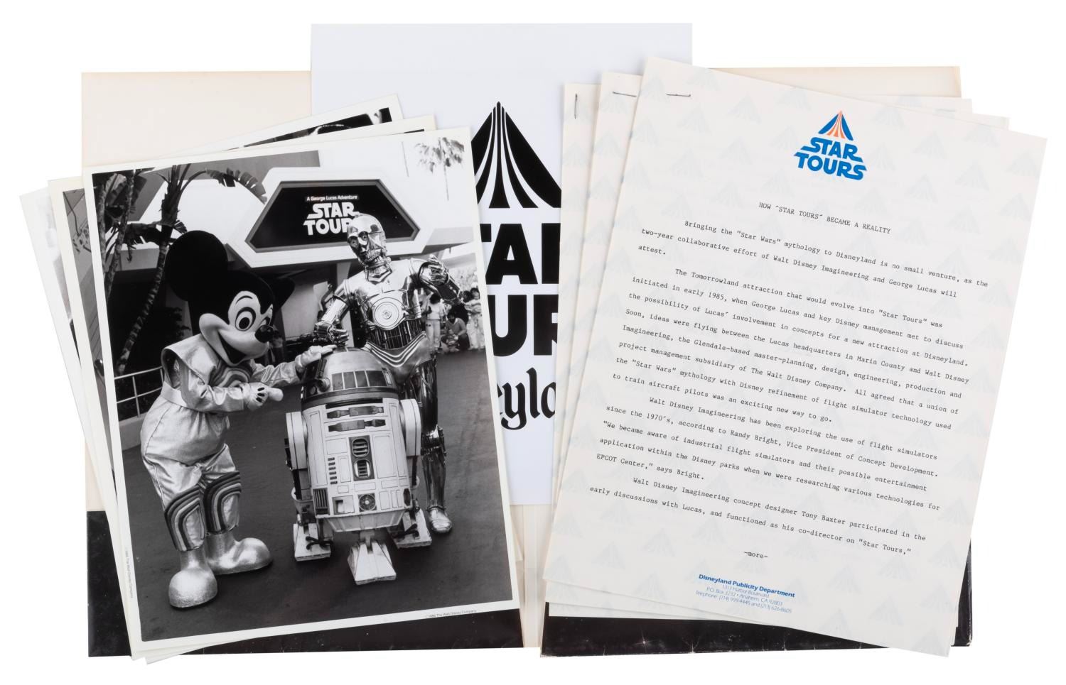 (Disneyland, 1987) A press kit for the opening of Star Tours at Disneyland. Inside are four black and white publicity photos and five press releases from Disney’s Publicity Department about the attraction and “Star Wars” creator George Lucas. Ranging in size from 8” x 10” photos to the 8.5” x 11” press releases, the items are in very good to fine condition with one page of a press release detached from its staple, while the 9” x 12” branded folder is in fair condition with creases, indentations from writing, stains, and wear.