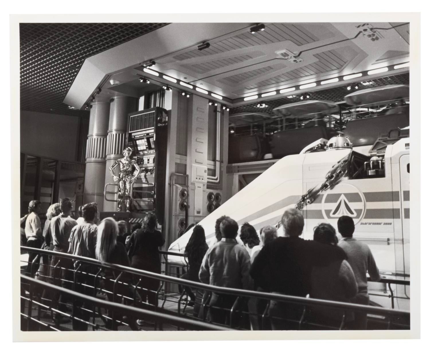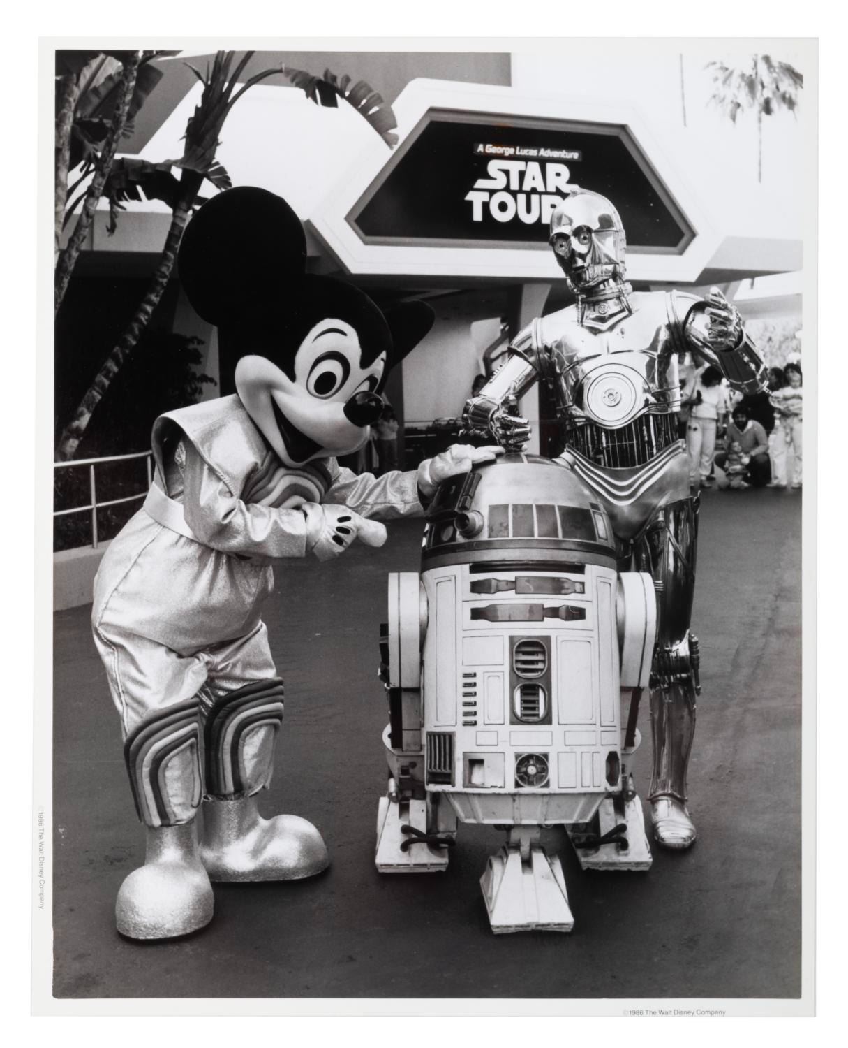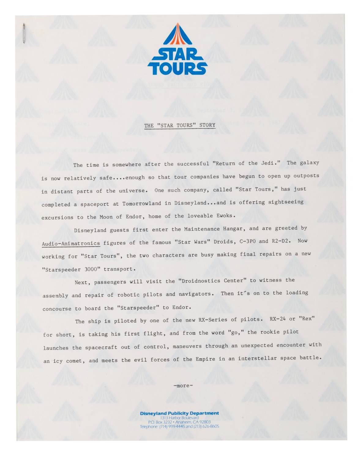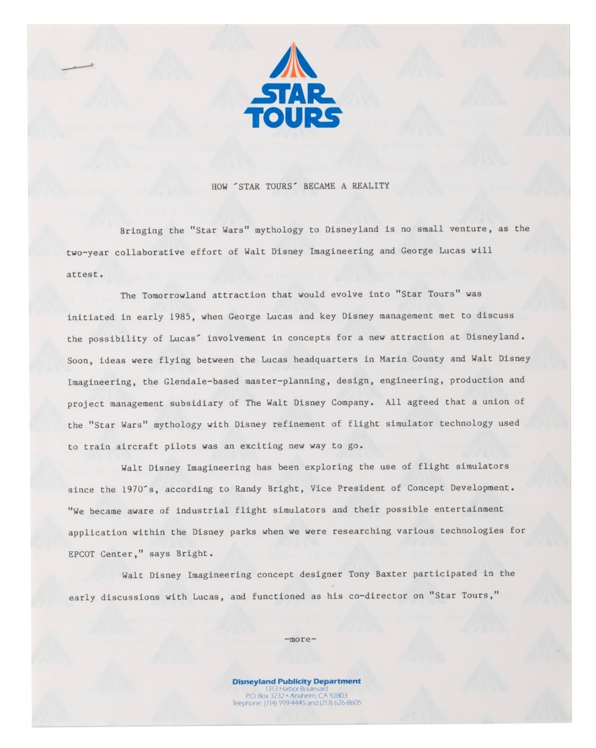 (Disneyland, 1987) A press kit for the opening of Star Tours at Disneyland. Inside are four black and white publicity photos and five press releases from Disney’s Publicity Department about the attraction and “Star Wars” creator George Lucas. Ranging in size from 8” x 10” photos to the 8.5” x 11” press releases, the items are in very good to fine condition with one page of a press release detached from its staple, while the 9” x 12” branded folder is in fair condition with creases, indentations from writing, stains, and wear.