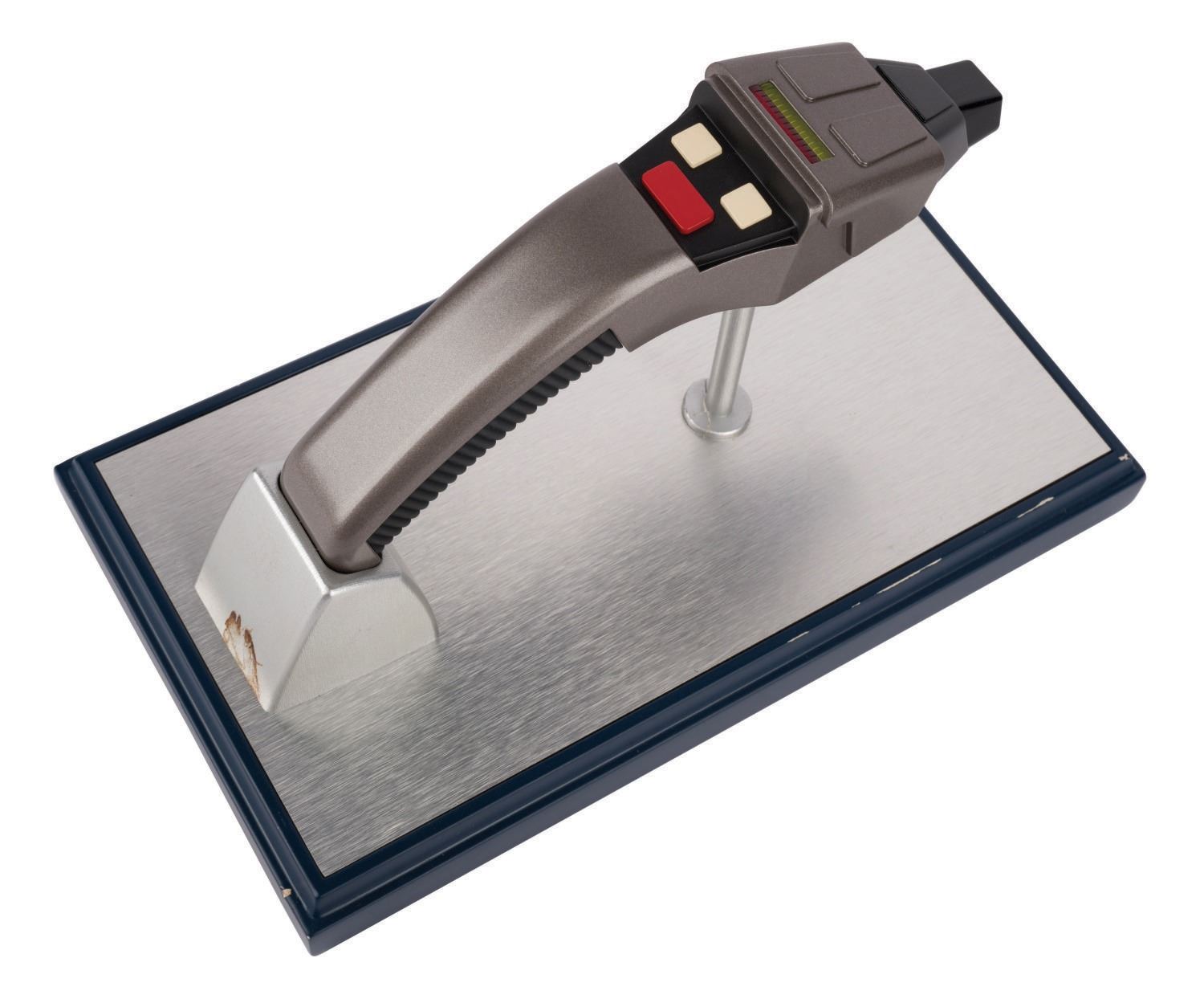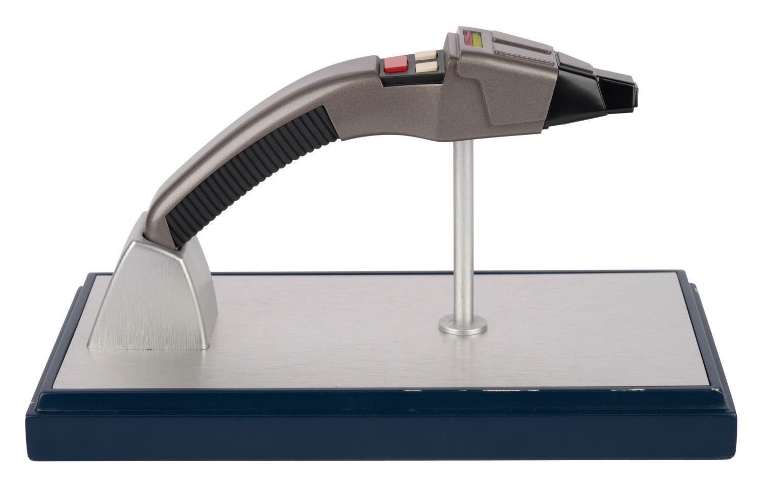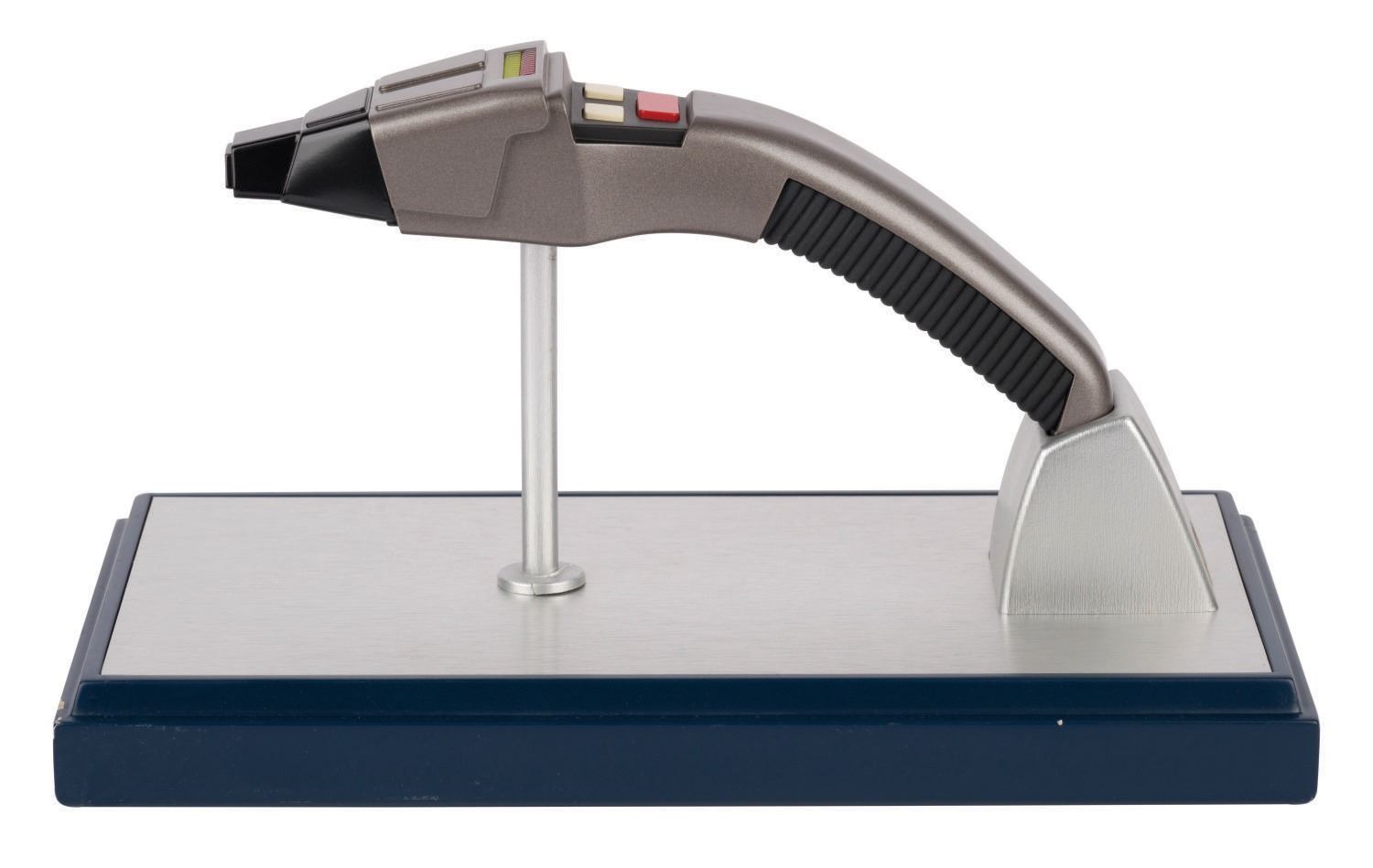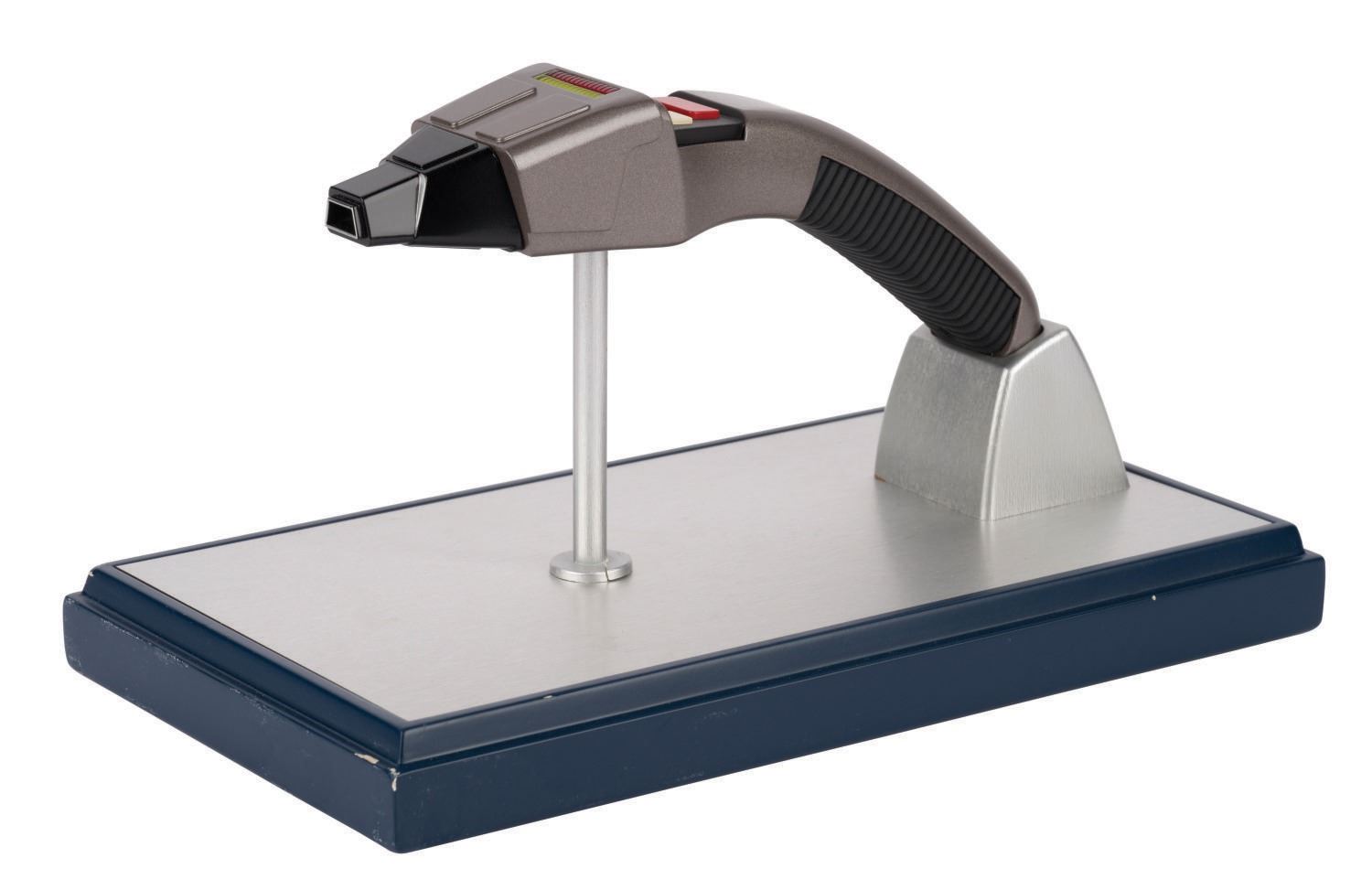 (Master Replicas, 2003) A Limited Edition Star Trek Type II Phaser. The 1:1 reproduction is an exact replica of the Type II Phaser seen in "Star Trek: First Contact." Released in an edition of 1,500, this is one of very few unnumbered pieces produced outside the regular edition. Measuring 8" long, the phaser displays atop a 10.5"x6" base and is in fine condition. This phaser has been tested and has functioning light features, but non-functioning sound.