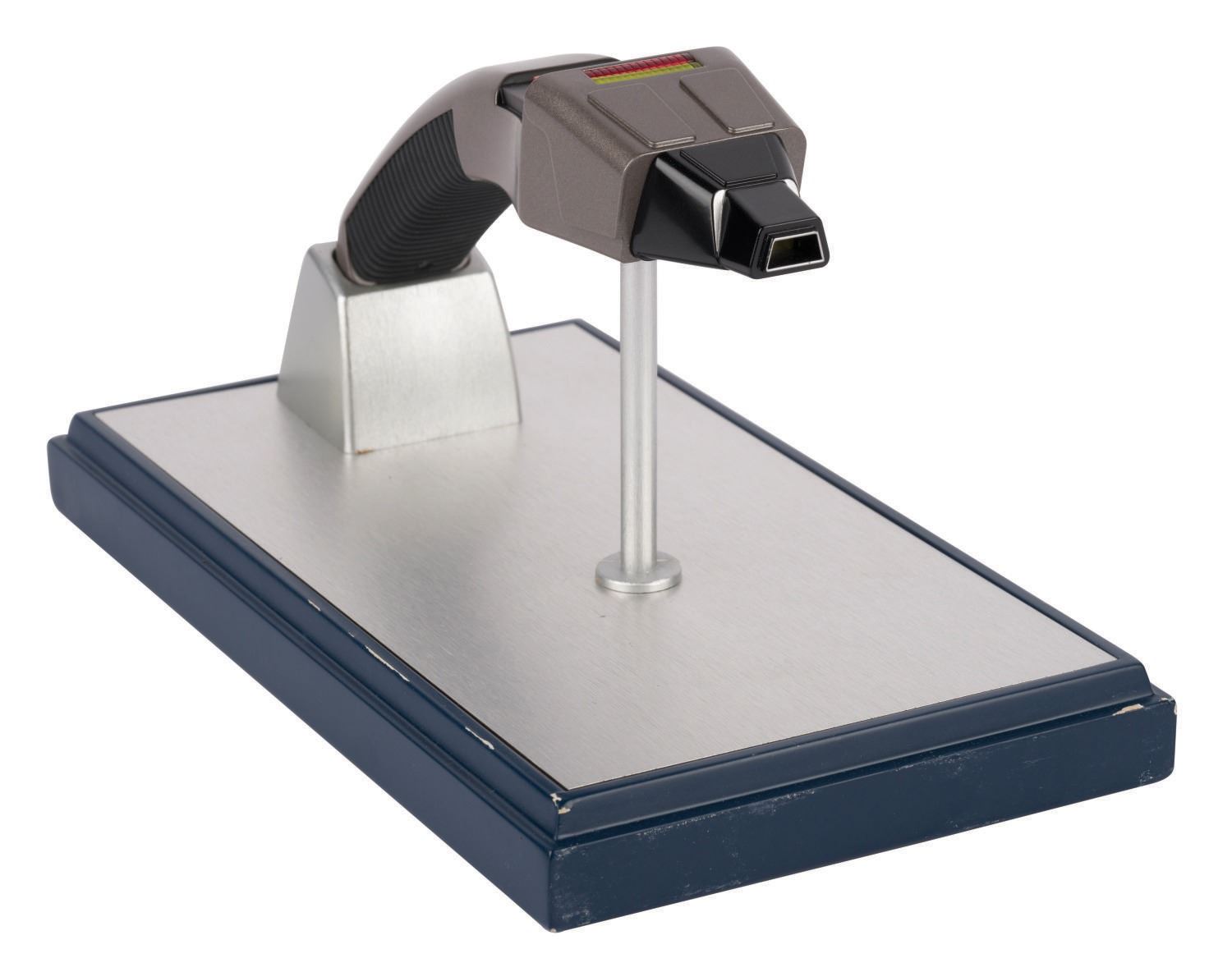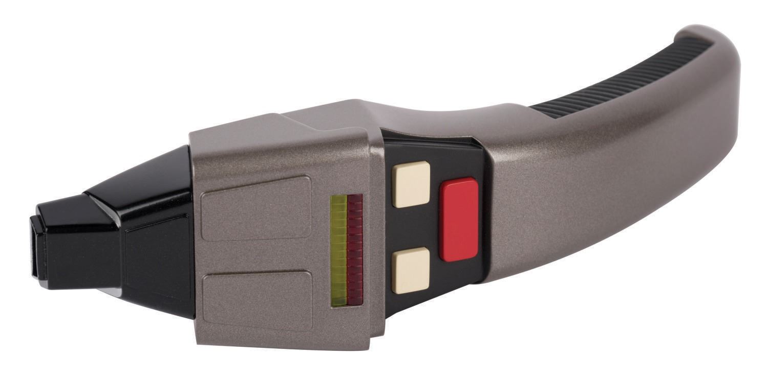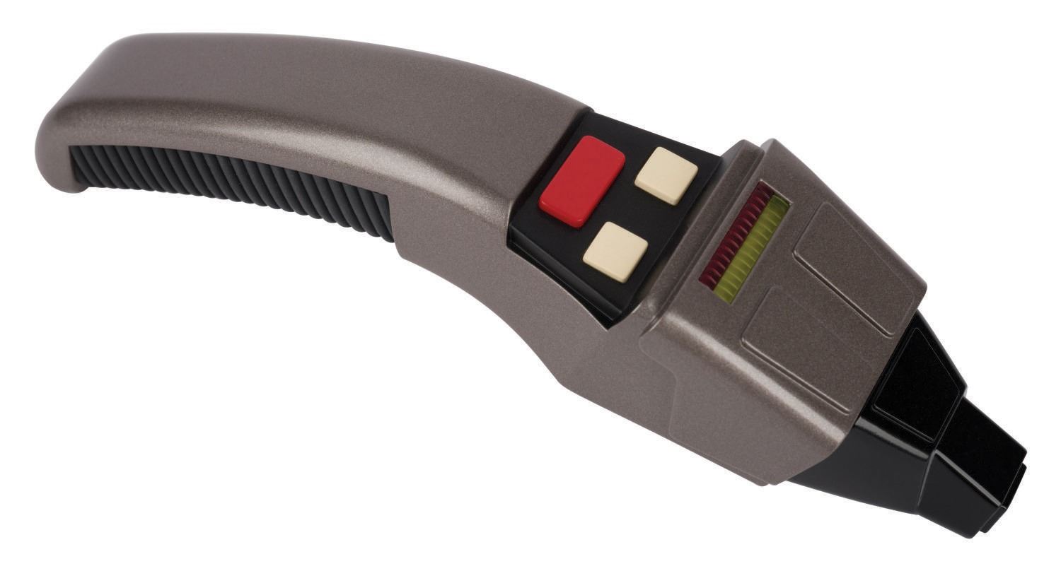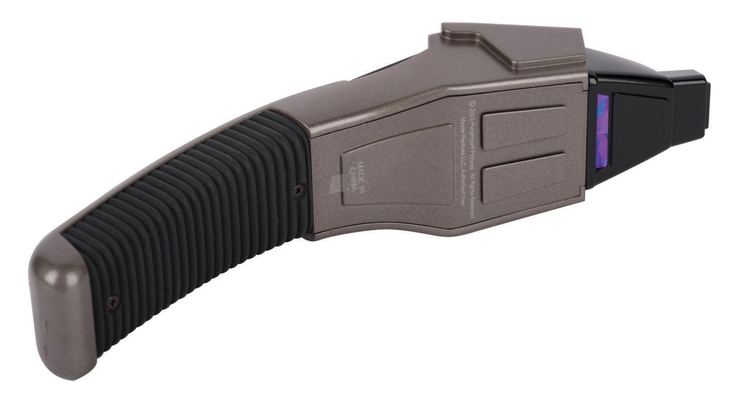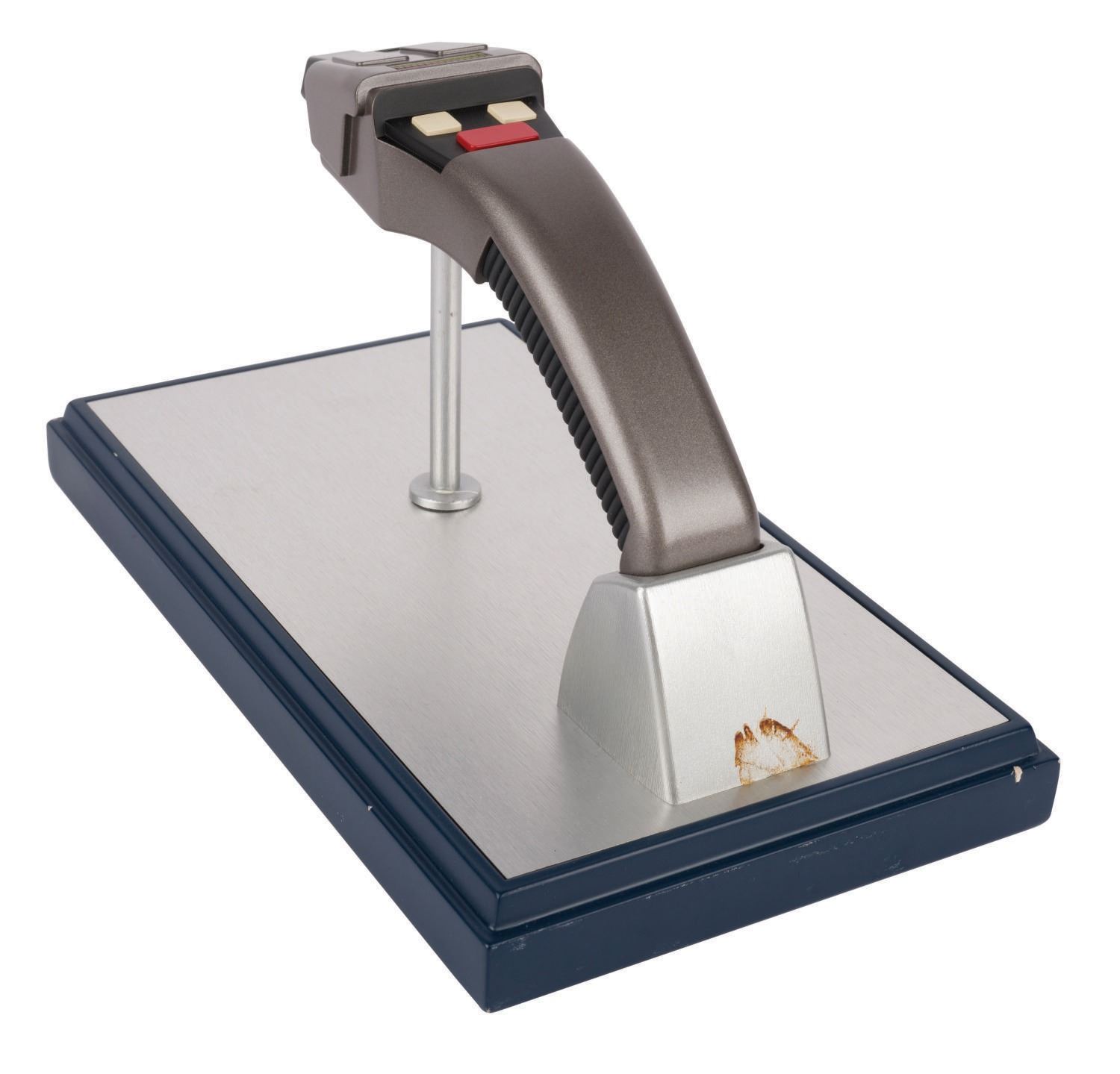 (Master Replicas, 2003) A Limited Edition Star Trek Type II Phaser. The 1:1 reproduction is an exact replica of the Type II Phaser seen in "Star Trek: First Contact." Released in an edition of 1,500, this is one of very few unnumbered pieces produced outside the regular edition. Measuring 8" long, the phaser displays atop a 10.5"x6" base and is in fine condition. This phaser has been tested and has functioning light features, but non-functioning sound.