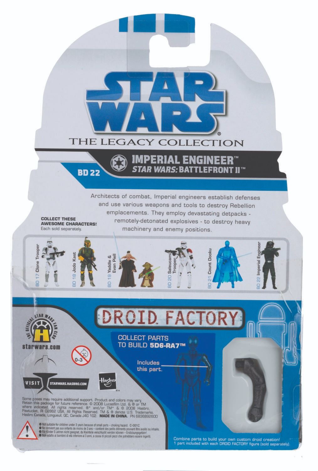 (Hasbro, 2008) A Star Wars The Legacy Collection Imperial Engineer: Star Wars Battlefront II action figure sealed on the original card. This pre-production version of the figure has a grey vest, while the final product was released with a black vest. Measuring roughly 1.5" x 3.75", on the original 6" x 9" card, the action figure is in fine condition.