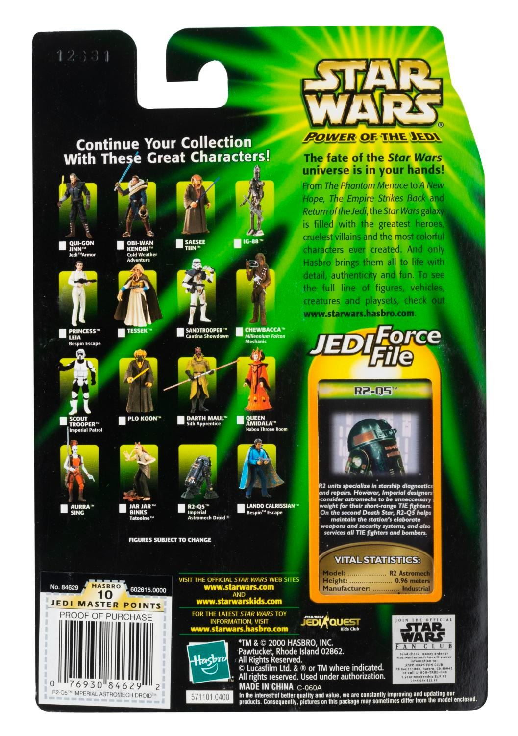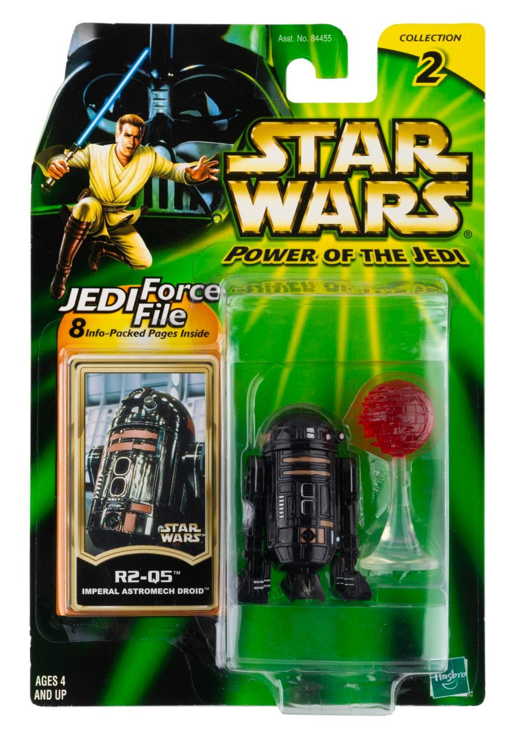 (Hasbro, 2000) An R2-Q5 Imperial Astromech Droid figure and Jedi Force File from Hasbro’s Star Wars: Power of The Jedi series. The 2.5” figure is sealed on its original 6” x 9” backing card and displays in very good condition with very light edge wear to the card.