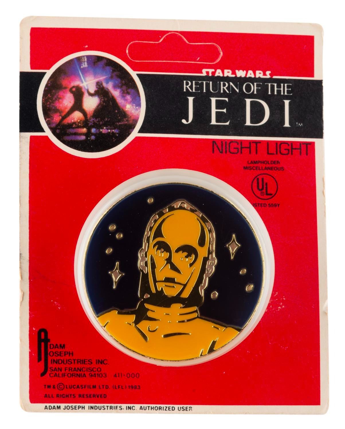 (Adam Joseph Industries, 1983) A "Star Wars: Return of the Jedi” C-3PO night light manufactured by Adam Joseph Industries. Measuring 2” in diameter on its original 3.5” x 4.5” backing card, the night lite is in very good working condition with light wear to the card.