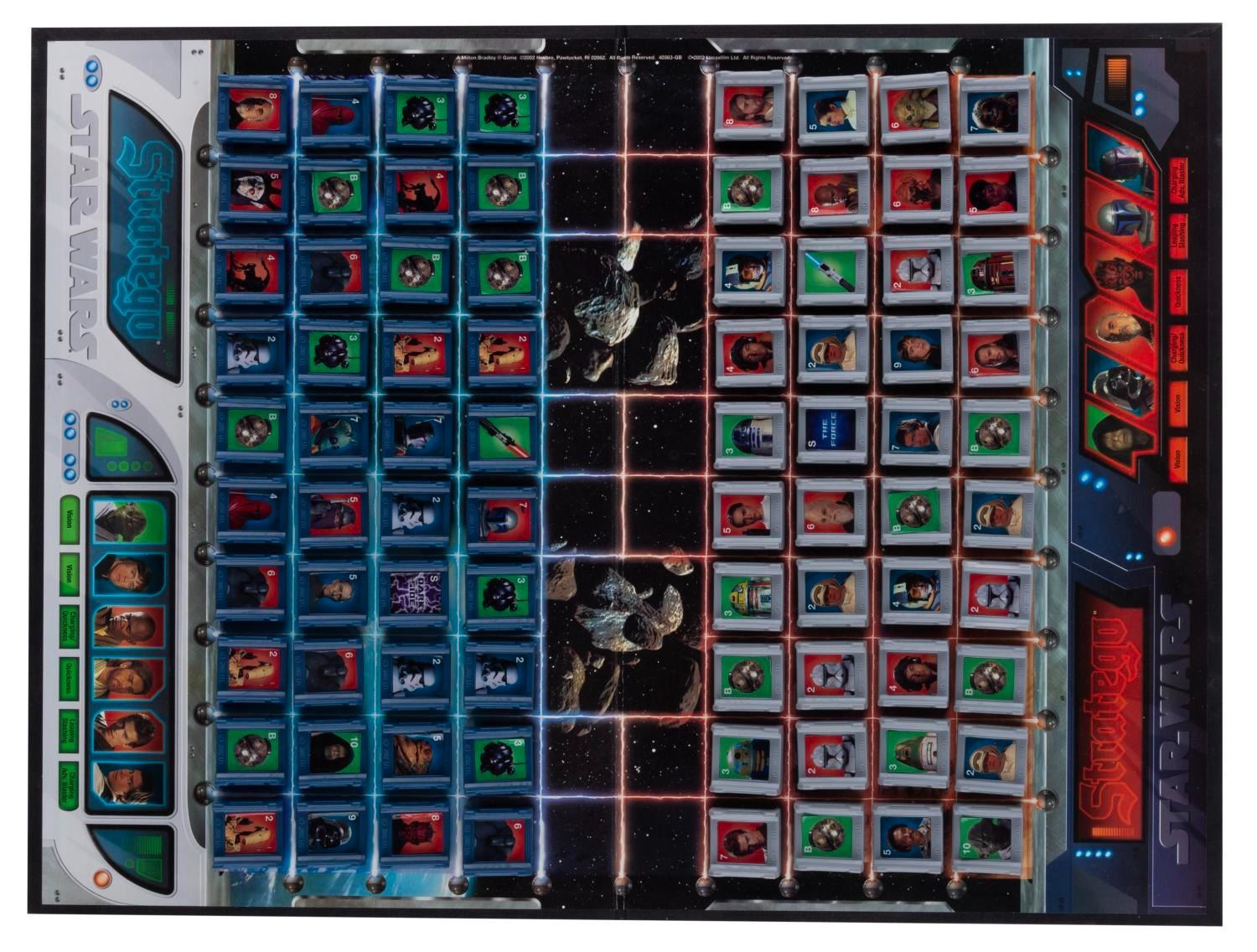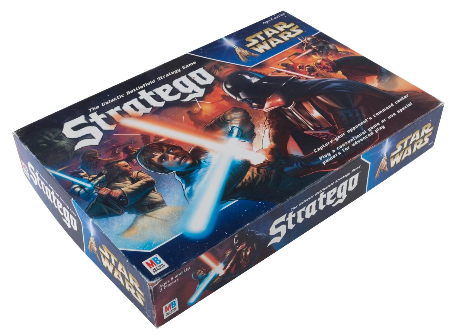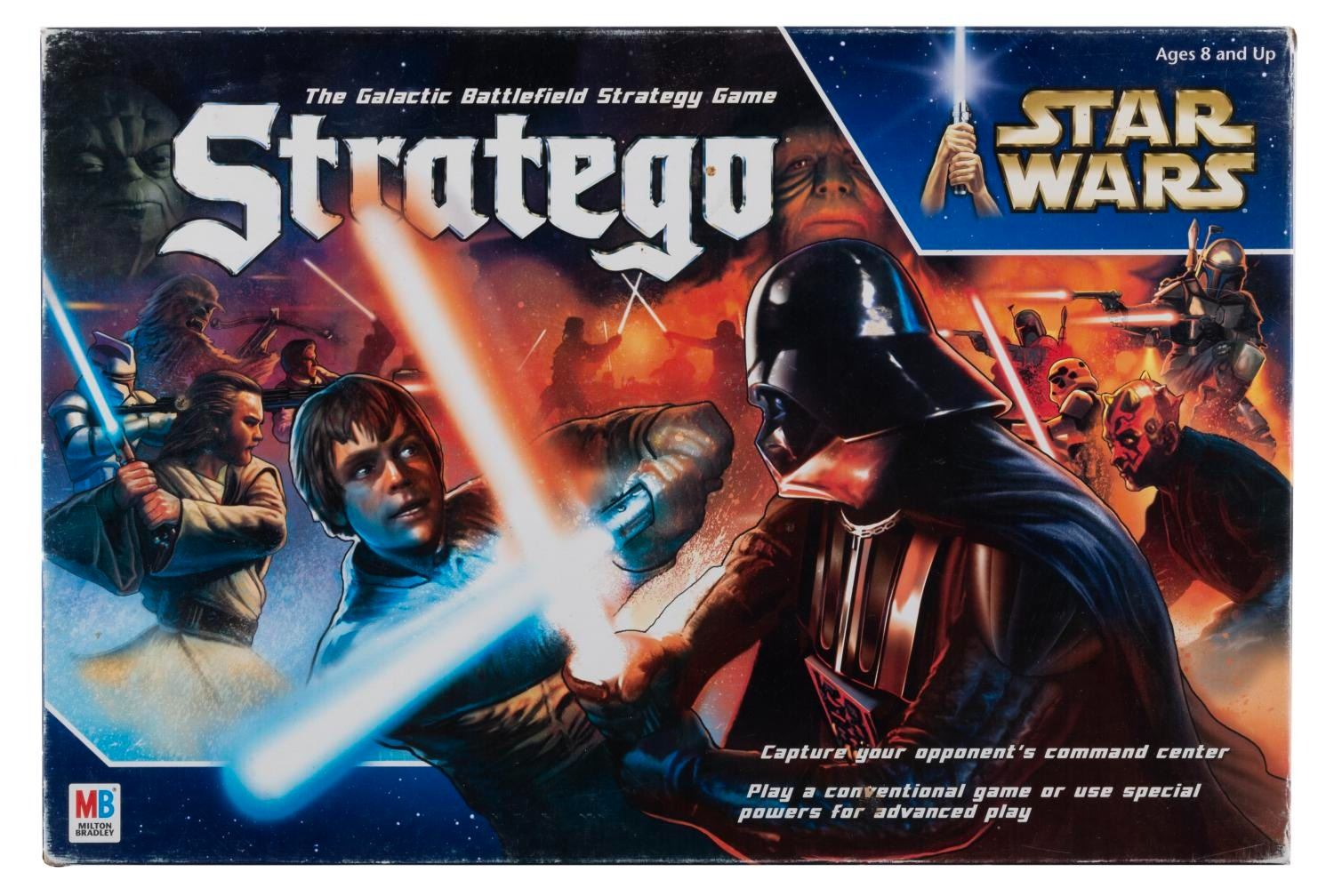 (Milton Bradley, 2002) A Star Wars Edition Stratego game, featuring characters from throughout the first six films of the saga. The game is complete and in very good condition, with a printout of the instructions. The box is in good condition with edge wear and small scuffs.