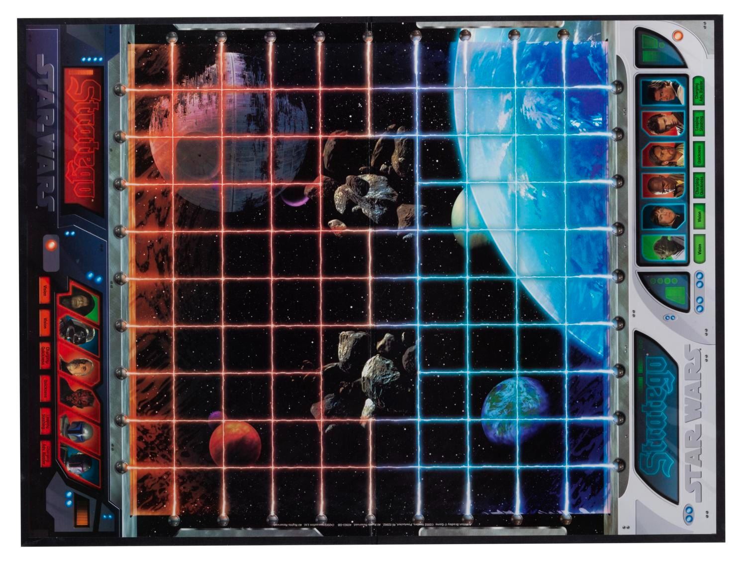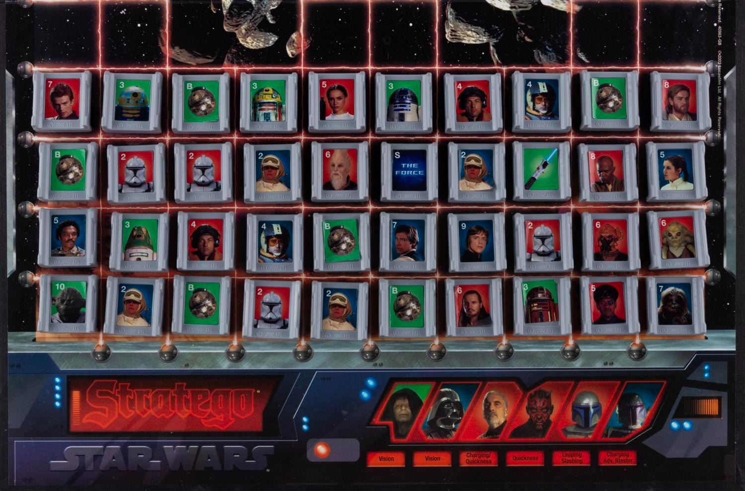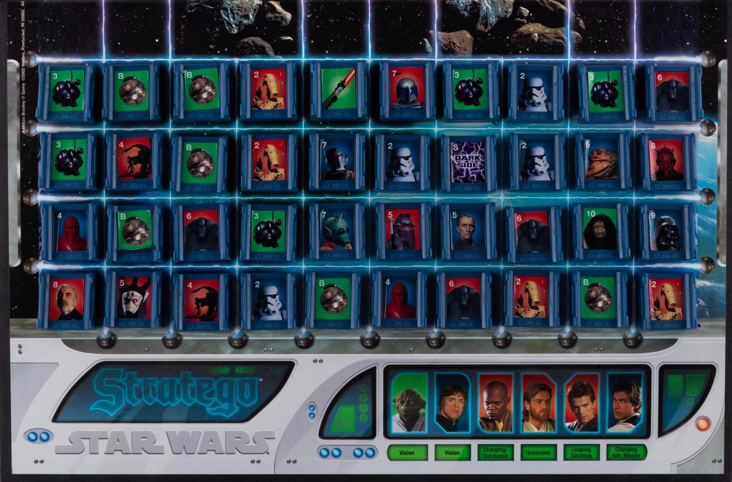 (Milton Bradley, 2002) A Star Wars Edition Stratego game, featuring characters from throughout the first six films of the saga. The game is complete and in very good condition, with a printout of the instructions. The box is in good condition with edge wear and small scuffs.