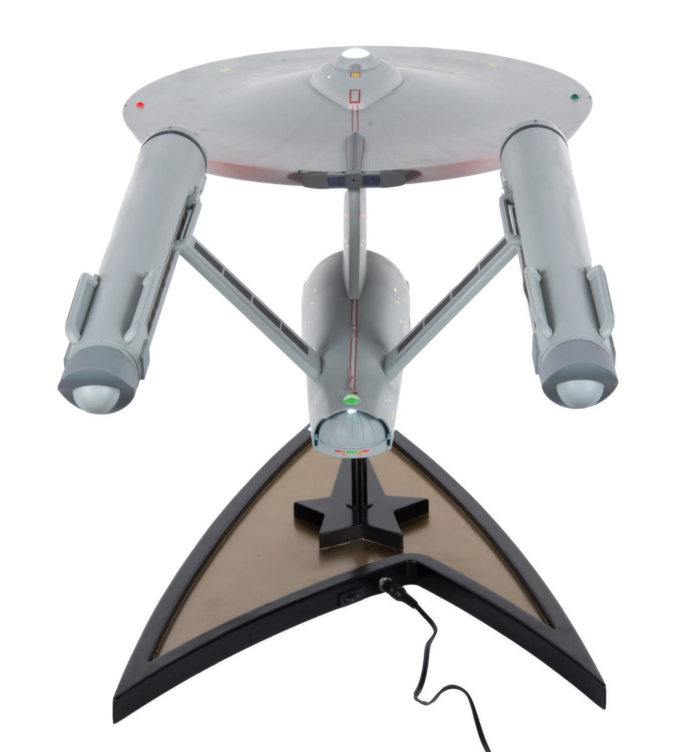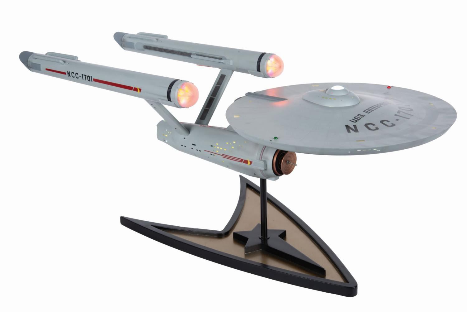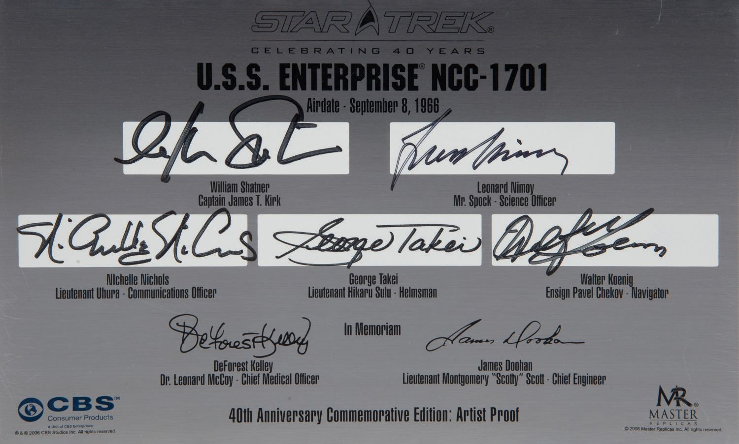 (Master Replicas, 2006) A rare 2nd Factory Engineering Prototype of the 40th Anniversary Commemorative Edition U.S.S. Enterprise model by Master Replicas. This prototype was the second sent from the factory to Master Replicas for approvals. It features hand-painted lines on the hull, "Black Weathering" paint details, no clear coat on decals, and working illumination including the bridge, lower sensor array, and warp drive nacelle lights. The base has an alternate color scheme and an unusual 3.5mm jack, which was not approved and differs from final assembly line product. It comes with a plaque signed by William Shatner (Captain James T. Kirk), Leonard Nimoy (Mr. Spock), Nichelle Nichols (Lieutenant Uhura), George Takei (Lieutenant Sulu), and Walter Koenig (Ensign Chekov). Measuring 32" long, 14.5" at its widest, 8" tall (and 13.5" tall, atop base), the replica is in fine condition. A 12-volt adapter is required for the electronics.