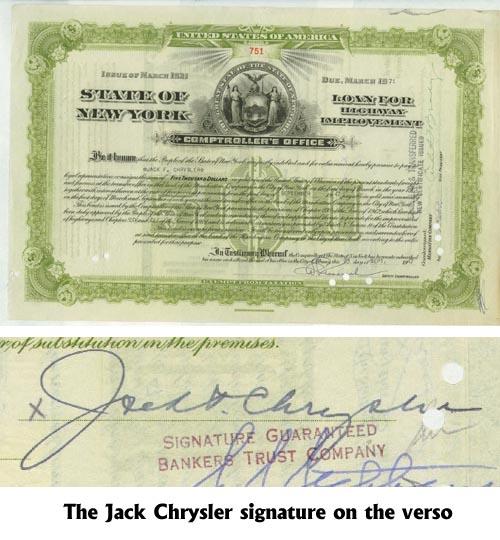 Jack Chrysler. DS. 1pp. 14 3/4" x 9 1/4". New York. September 23, 1947. A "State of New York Loan for Highway Improvement" bond for $5,000 issued to and signed by Jack Chrysler on the verso. Lightly punch cancelled, including one barely touching the signature; it is in very fine condition overall.