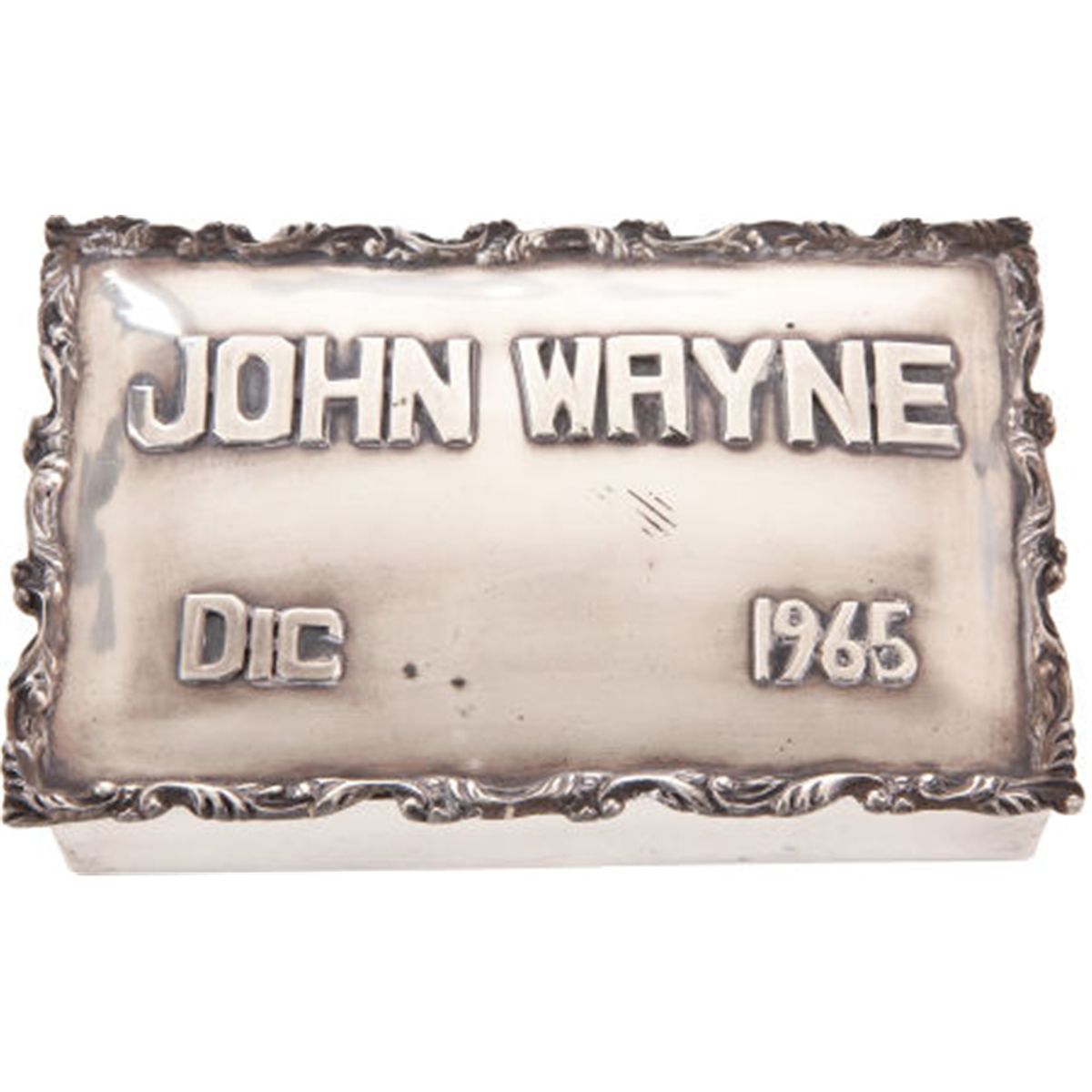 A Sterling Silver Box, 1965. With a decorative lid reading "John Wayne / DIC / 1965," bottom stamped "C. Boler / Sterling / 0.925/1000, inside lined in wood.4" x 6" x 1 1/2"