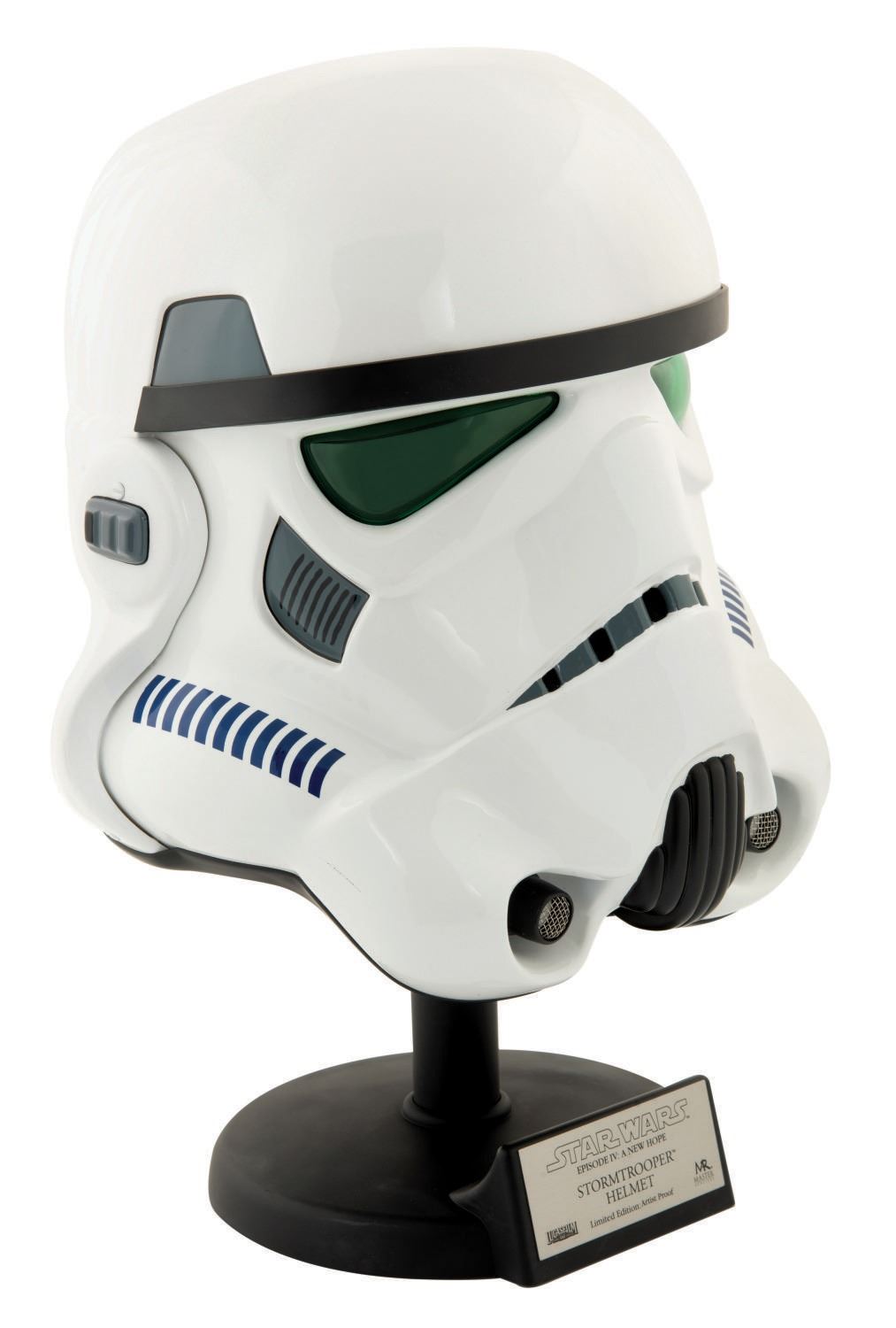 (Master Replicas, 2007-08) A Limited Edition Stormtrooper Helmet by Master Replicas. The 12"x12.25" green lens variant helmet is a 1:1 reproduction of an original stunt helmet from "Star Wars: A New Hope," produced in an edition of 2,500. This Artist Proof is one of very few unnumbered pieces produced aside from the numbered edition. The helmet has a total height of 16" upon its display stand and is in fine condition exhibiting few slight scuffs from handling.