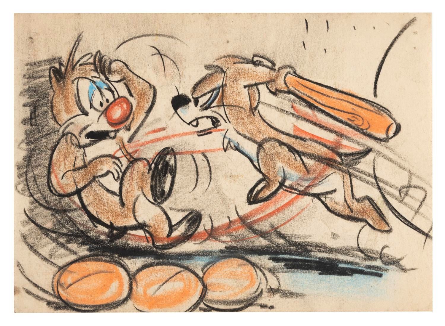 (Disney, 1940s-50s) An original storyboard panel featuring Chip and Dale from an unproduced cartoon. Accomplished in mixed media, the panel measuring 6" x 8.25" is in very good condition with typical wear from production use and age.