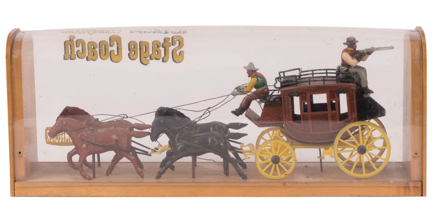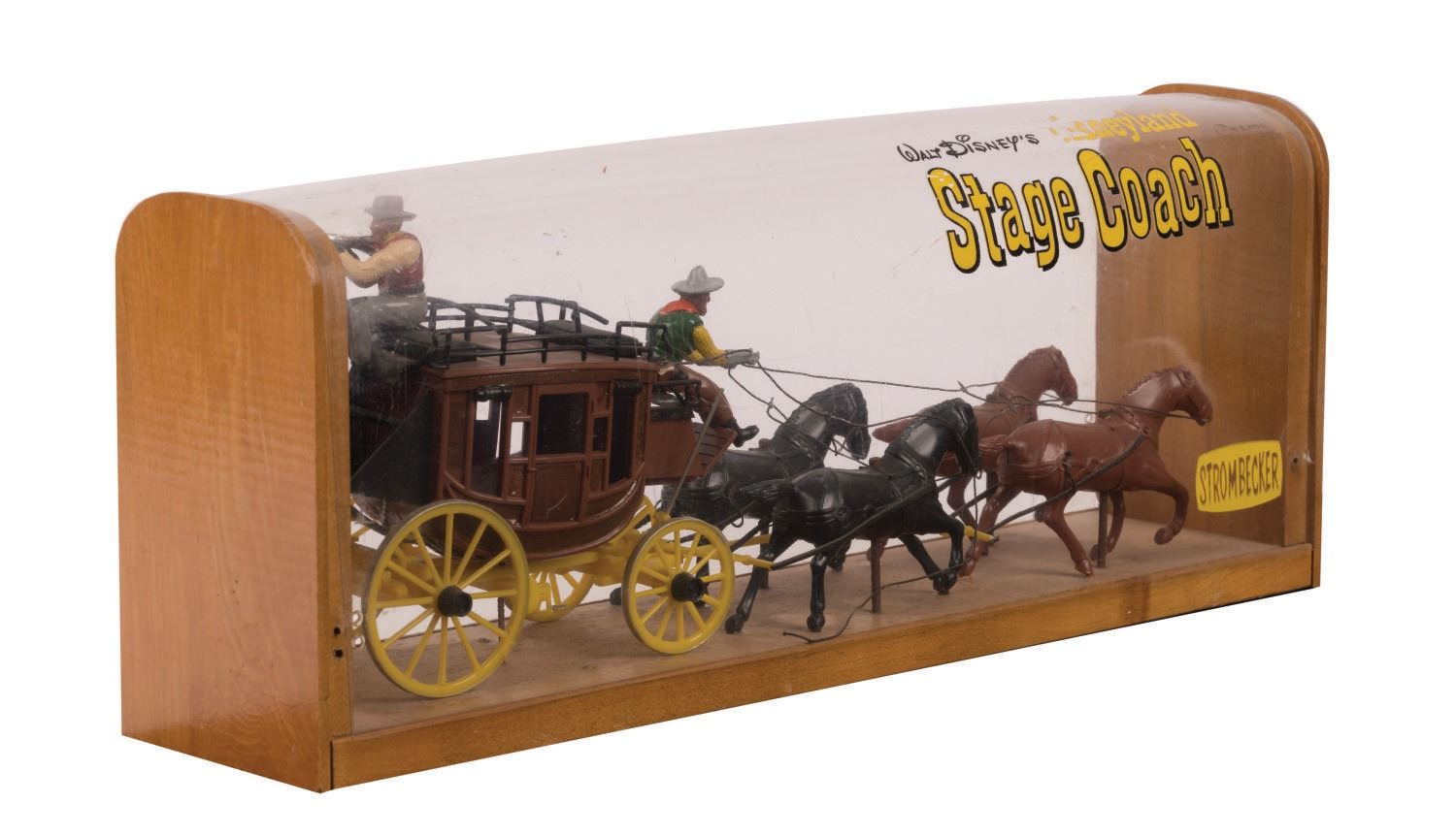 (Disneyland, 1950s-60s) A rare Strombecker Walt Disney's Disneyland Stagecoach Model store display. The 5" tall and 12" long completed model features expertly hand-painted figures and is mounted for display within its 5.75"x14.5"x3.25" wooden and plastic clamshell display featuring the official logo and typeface of both the product and manufacturer. Displays like this were prepared for hobby shops, department stores, and where all fine Strombecker Disneyland products were once offered (including Disneyland). The model is in very good condition overall with few loose reigns, one detached plastic part, and minor wear to model and case from handling and display.