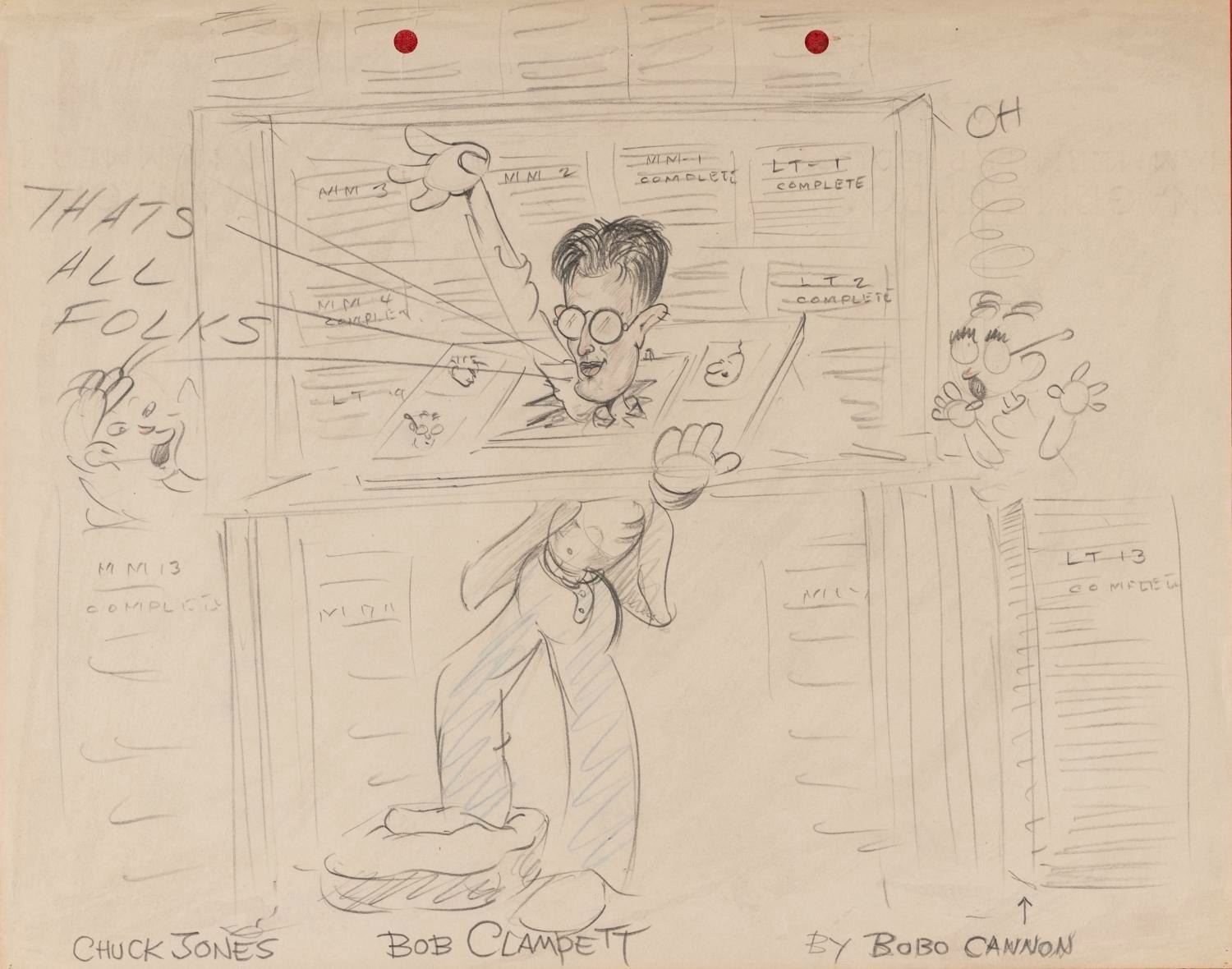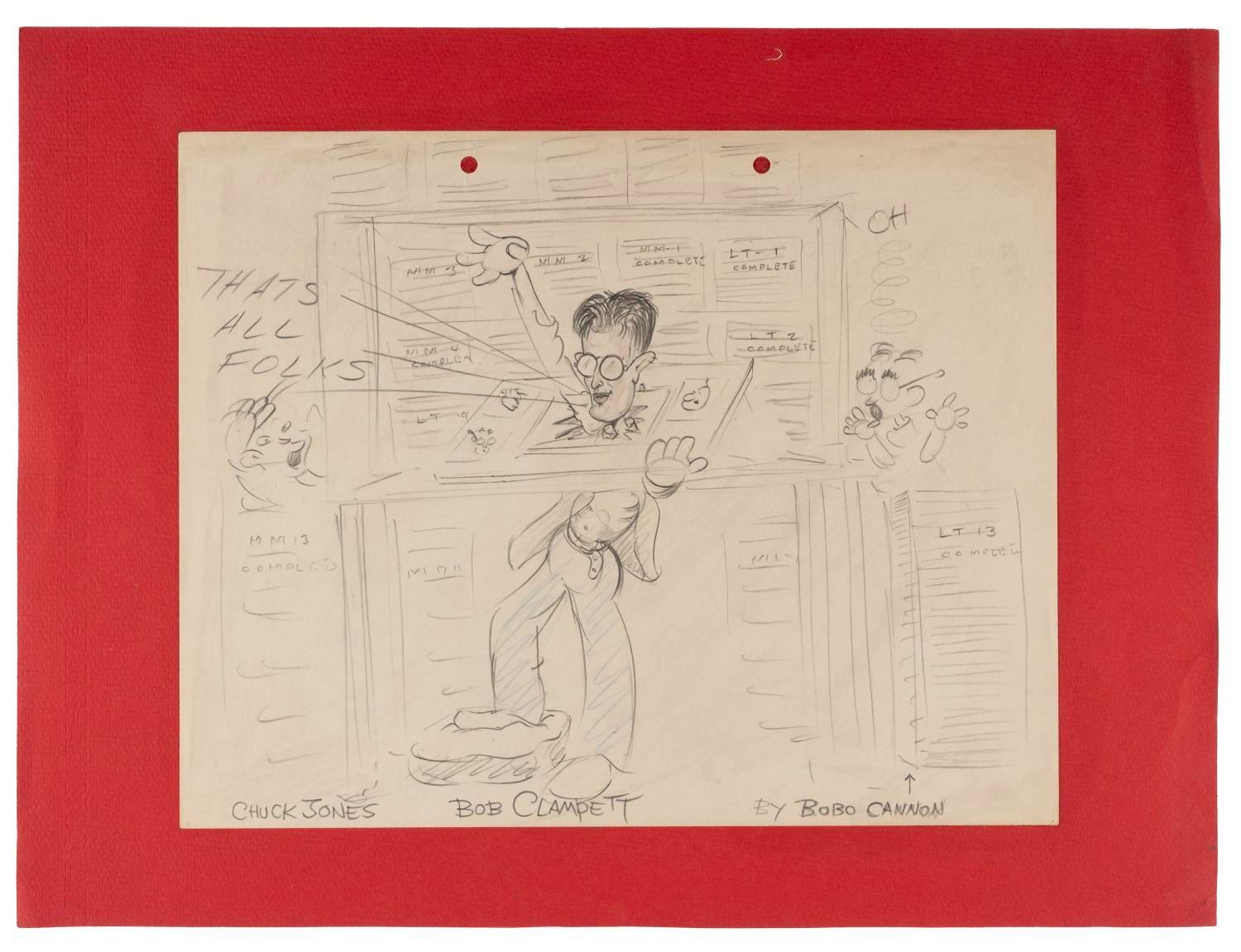 (Cannon, 1930s-40s) A studio gag drawing by animator Robert “Bobo” Cannon of Bob Clampett, Chuck Jones, and himself. Accomplished in graphite and colored pencil and measuring 9.5” x 12”, the drawing is in good condition with pinholes from display, adhesive residue on the reverse visible from the front, and light discoloration from age. The drawing is mounted on 12.25” x 16.25” construction paper in good condition, partially detached from the mounting, with edge wear and creasing.