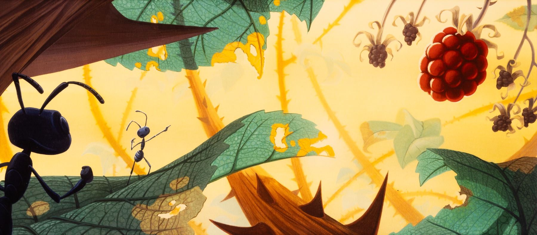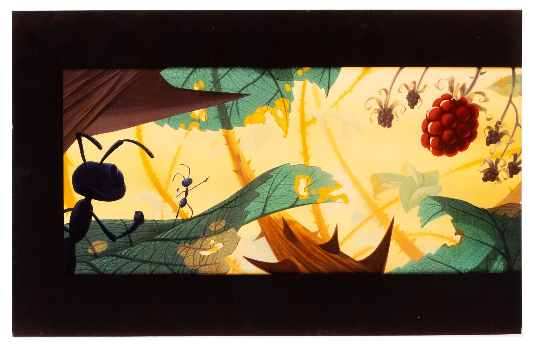 (Disney, 1990s) An original print of digital concept art from Pixar’s “A Bug's Life.” Featuring Flik pointing at a raspberry, the concept was created at the studio and printed in a limited quantity to be used during the development of the film and in pitch meetings. Measuring 11" x 17”, the piece displays in very good condition with light scratches and wear.