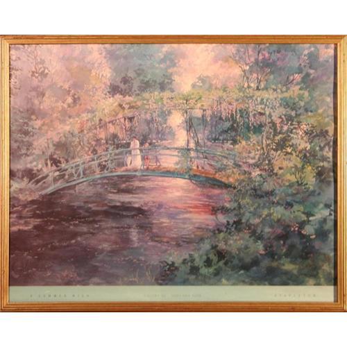 Talented Stapleton?s print entitled ?A Summer Wish? is a marvelously lush impressionist landscape. A woman and a young boy, in Victorian garb, stand along a bridge arcing over a steady river. The bridge?s trellis is dripping with flowers and vines and either side of the bridge is thick with plantlife- all painted in an impressionistic manner. Volumes of small brush strokes and shapes come together to build density and depth. The composition is filled with varying shades of violet, especially in the water and the trees in the background which recede into the distance due to the cool blue-violet tones. Shades of green saturate the areas of flourishing vegetation giving amazing life to the landscape. The soft sunlight filtering through the trees gives the scene a dreamy and serene quality, as if the figures are on the bridge really are looking out along the river and making a wish, perhaps for a longer summer.