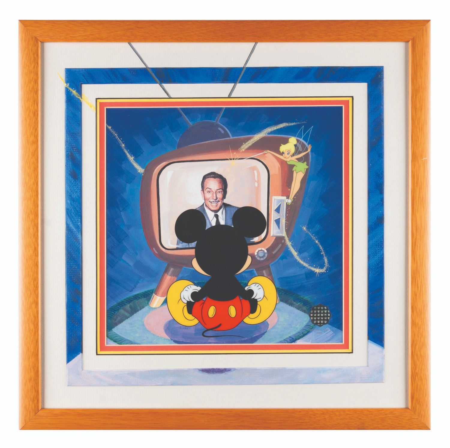 (Disney, 2000) A sericel titled “Sundays With Walt” featuring Mickey Mouse and Tinker Bell watching Walt on TV. The cel was produced in a limited edition of 2,500. This individual cel has been enhanced with a unique hand-painted matte that extends the image. With a visible image of 10.25” x 10.25” in a 17.5” x 17.5” frame, the piece is in very good condition with one small scratch to the frame.