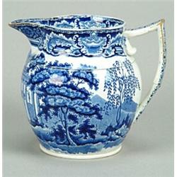 A Sundial pattern jug, with angular handle and turned rim around the shoulder, printed in blue with the classical scene and border of foliate scrolls, height 12.0cm, unmarked, circa 1820-30 (minor rubbing to spout, chip to footrim, star crack in base)
