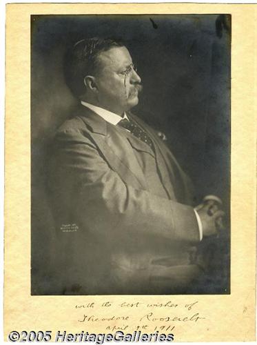 <B>A Superb Large Signed Photo of Theodore Roosevelt</B></I> The 9.25" x 13.25" photo itself is an original studio-quality print marked "Copyright 1907, Harris & Ewing, Washington, D.C." It is tipped onto original board which carries an embossed Harris & Ewing logo. TR has boldly inscribed it below the photo: "With the best wishes of Theodore Roosevelt April 9th, 1911." One of the largest TR signatures we have seen, measuring just under 6" in length! Great condition. Only dating as President would make it better; this is one of the nicest autographed Teddy photos we've seen. <I>Accompanied by COA from PSA/DNA.</B></I>
