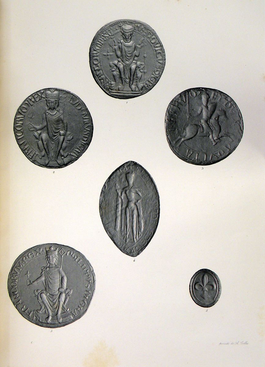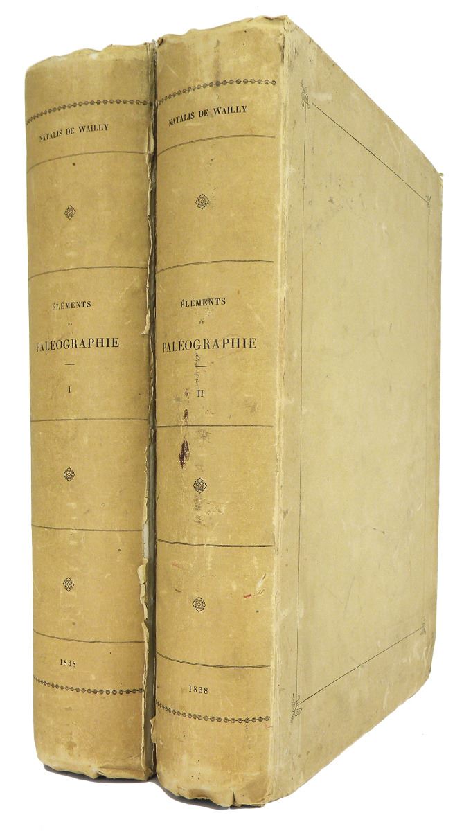 Natalis de Wailly, M. ÉLÉMENTS DE PALÉOGRAPHIE. POUR SERVIR A L'ÉTUDE DES DOCUMENTS INÉDITS SUR L'HISTOIRE DE FRANCE PUBLIÉS PAR ORDRE DU ROI ET PAR LES SOINS DU MINISTRE DE L'INSTRUCTION PUBLIQUE. ... Paris: Imprimerie Royale, 1838. Four parts as issued in two volumes. Thick folio [38 by 29 cm], original publisher's cream boards; spines lettered in black. (4), xii, 716 + (4), iv, 452 pages; tables; 17 fine plates of facsimile alphabets, inscriptions, documents, etc.; 20 fine plates, procédé de A. Collas, depicting 127 seals. Bindings a bit worn; unopened; internally fine. See catalogue for full description.