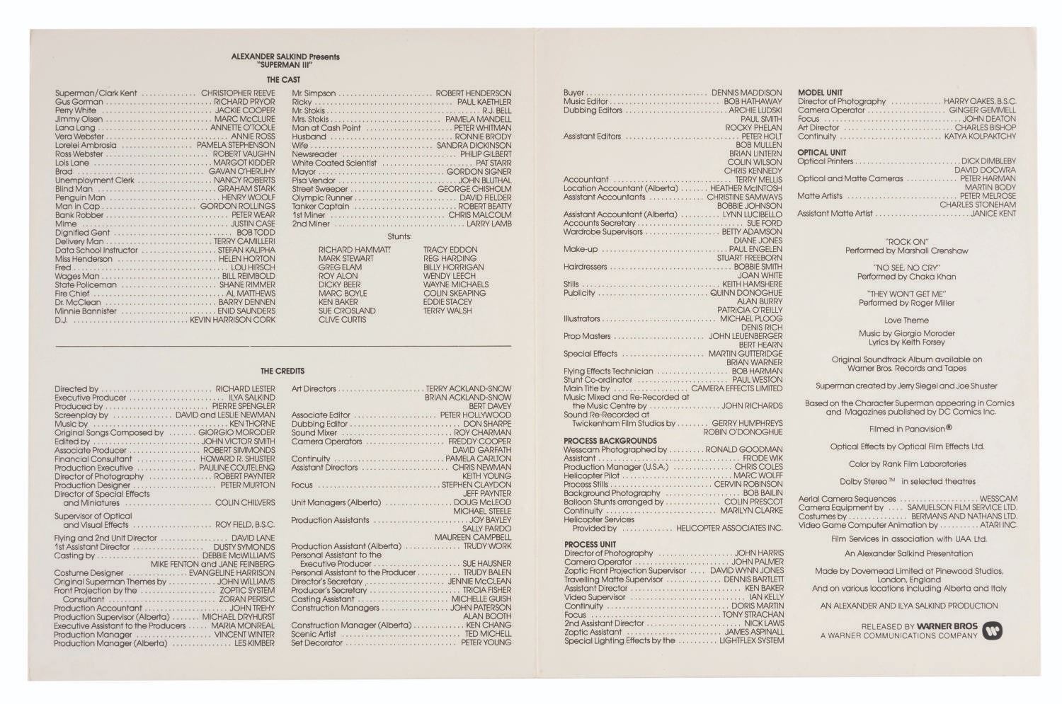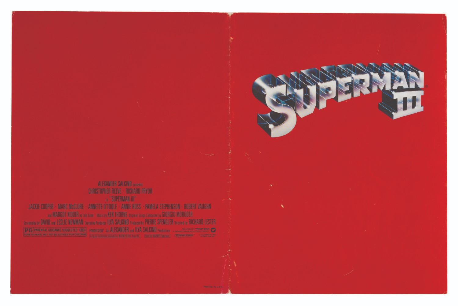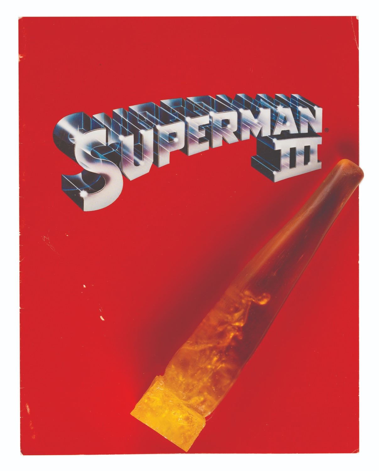 (Warner Bros., 1978) A Fortress of Solitude control panel crystal prop from "Superman” and a program from "Superman III.” Measuring 8” x 1.5” x 1.5”, the resin crystal is in good, production-used condition with heavy discoloration from age, while the 8.5” x 11” program is in good condition with scratches, creasing, and edge wear.
